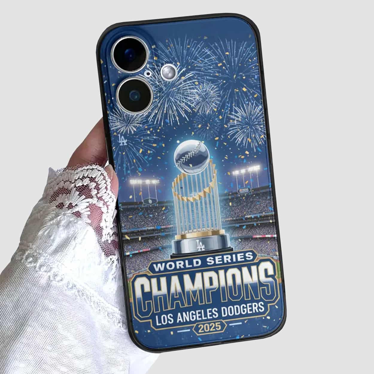 Step up your fan game with this case — a tribute to one of the most electrifying moments in baseball history. The design bursts with energy: fireworks light up the sky, a stadium glows with victory, and the World Series trophy takes center stage. Bold text reads “CHAMPIONS WORLD SERIES LOS ANGELES DODGERS 2025,” making it clear — this isn’t just a phone case, it’s a celebration in your pocket.