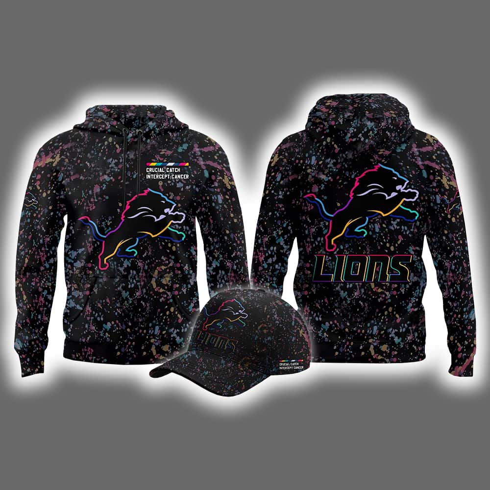 Turn heads and tackle cancer with flair in the 2025 Lions Crucial Catch Intercept Cancer Hoodie Cap. This eye-popping duo features a black canvas drenched in a riot of multicolored splatter-paint, spotlighting the Lions’ iconic lion logo in electrifying hues. The front of the hoodie proudly declares “LIONS”, while the back roars with a larger-than-life lion emblem and the word “LIONS” stamped below. The matching cap completes the look with the same energetic design and logo front and center.