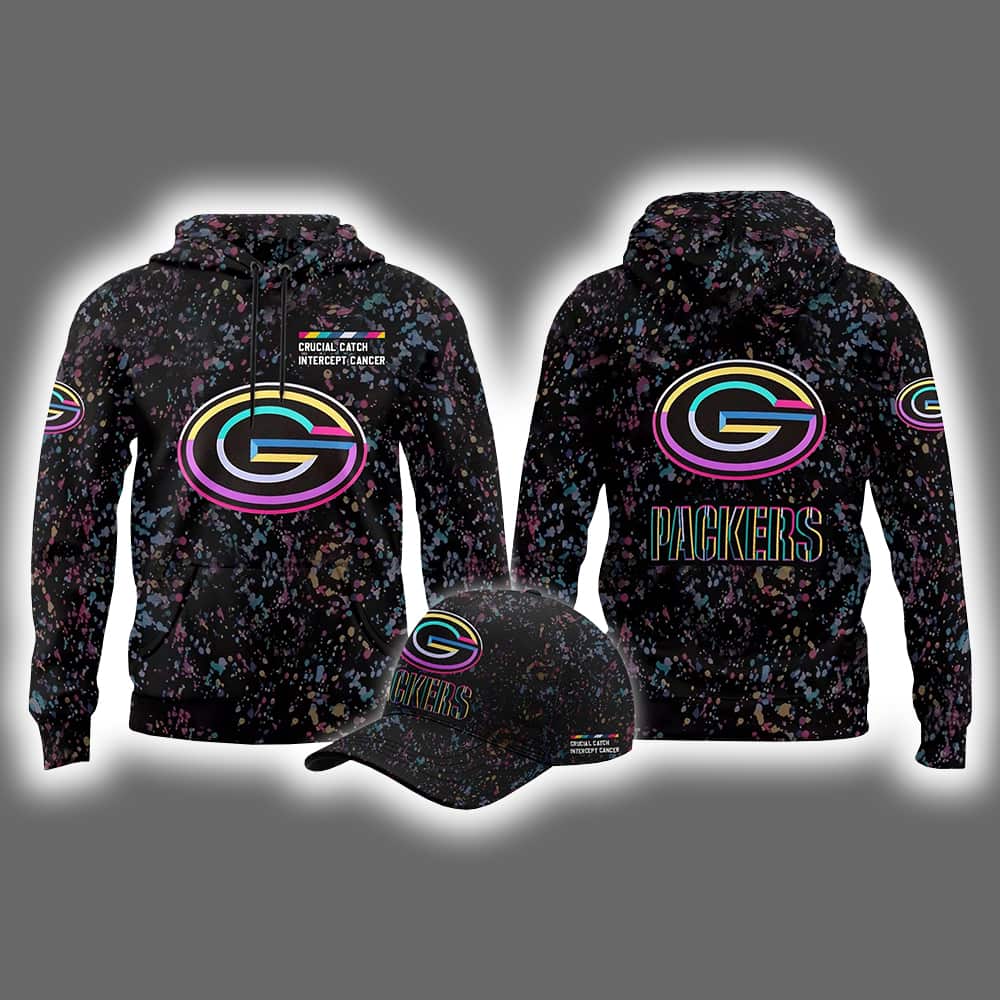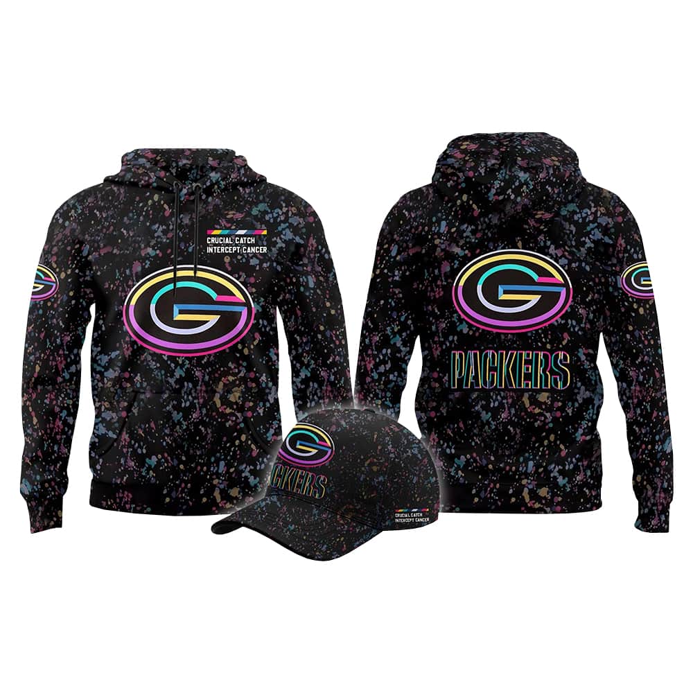 Turn heads and spark conversations with the 2025 Packers Crucial Catch Intercept Cancer Hoodie Cap. This electrifying set features two hoodies and a cap drenched in a vivid paint-splatter motif that screams energy and resilience. The iconic “G” logo bursts in rainbow hues across the chest and crown, with “PACKERS” boldly stamped below in matching multicolor flair. Whether you’re rocking the front-facing hoodie or showing off the back design, this gear makes a statement from every angle. The cap completes the look with its own splash of color and team pride—perfect for game day or any day you want to stand out.
