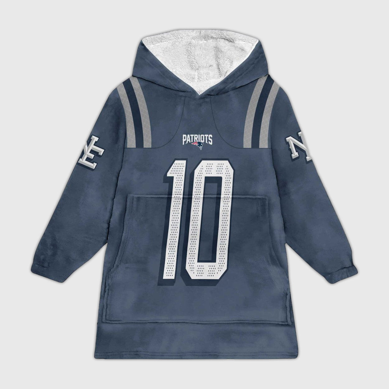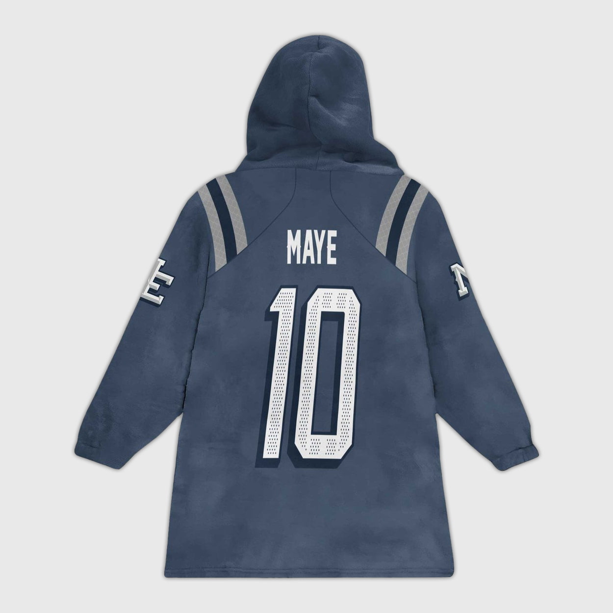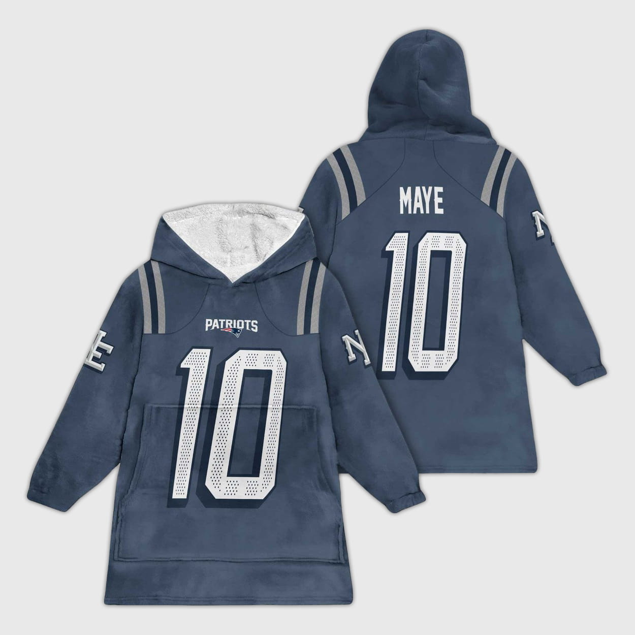 Drenched in storm blue with gray shoulder stripes that scream “defensive line chic,” this hoodie wraps you in warmth like a fourth-quarter comeback. The front boasts a bold “10” in perforated white digits, flanked by “PATRIOTS” and a logo that looks ready to tackle your fashion doubts. Flip it around and you’ll find “MAYE” above the same number—because subtlety is for the bye week. The stylized “NE” on each sleeve adds a final flourish, like end zone confetti for your arms.
