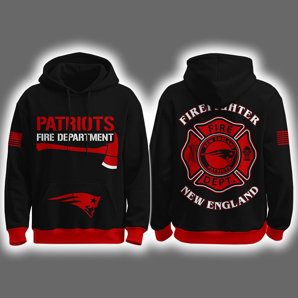 This set is a triple-threat tribute to courage, community, and championship spirit. The hoodie leads the charge with “PATRIOTS FIRE DEPARTMENT” emblazoned across the chest in bold red and white, backed by a fire axe graphic that means business. Near the hem, the iconic Patriots logo adds a fierce finish. Flip it around and you’ll find a firefighter emblem featuring a fire helmet and tools, framed by “FIREFIGHTER NEW ENGLAND” and “FIRE DEPT”—a nod to those who protect and serve.