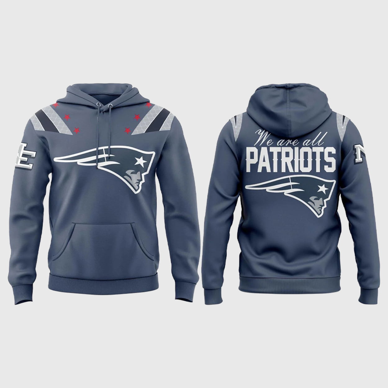 The hoodie commands attention with the Patriots logo front and center, flanked by silver-striped shoulder accents and red stars that feel more superhero than sportswear. A bold “NE” on the sleeve adds regional pride, while the back reads “We are all PATRIOTS”—a rallying cry that doubles as a team-wide high five. The joggers echo the slogan on the thigh and flash “NE” on the hip, keeping the energy alive from top to bottom. The cap completes the look with the same slogan and logo combo, plus a side-stitch “NE” that says, “Yes, I rep the dynasty—head to toe.”