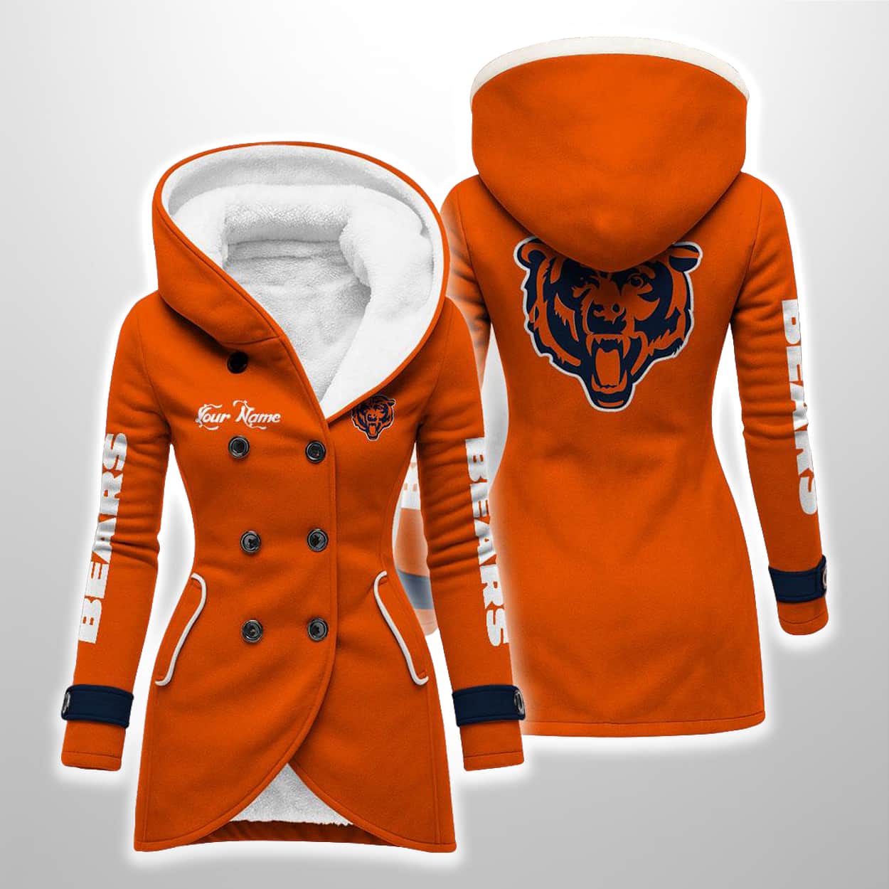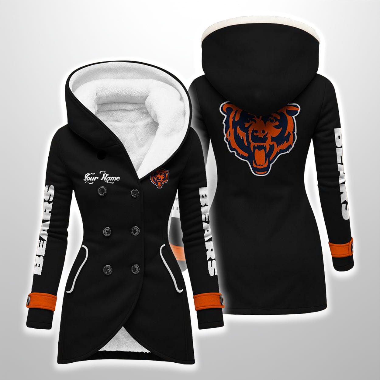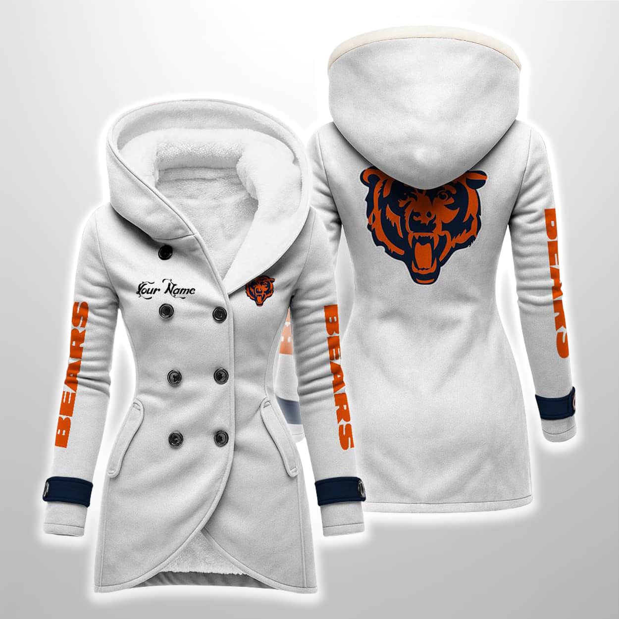 Boost your fandom with the “2025 Personalized Bears Long Hooded Fleece Jacket.” The design includes a fierce Bears logo on the back, a chest emblem, “BEARS” sleeve text in bold contrasts, and scripted name personalization. Key features: fur-lined hood for warmth, double-breasted buttons, adjustable cuffs, and knee-length cut, in team-inspired colors.