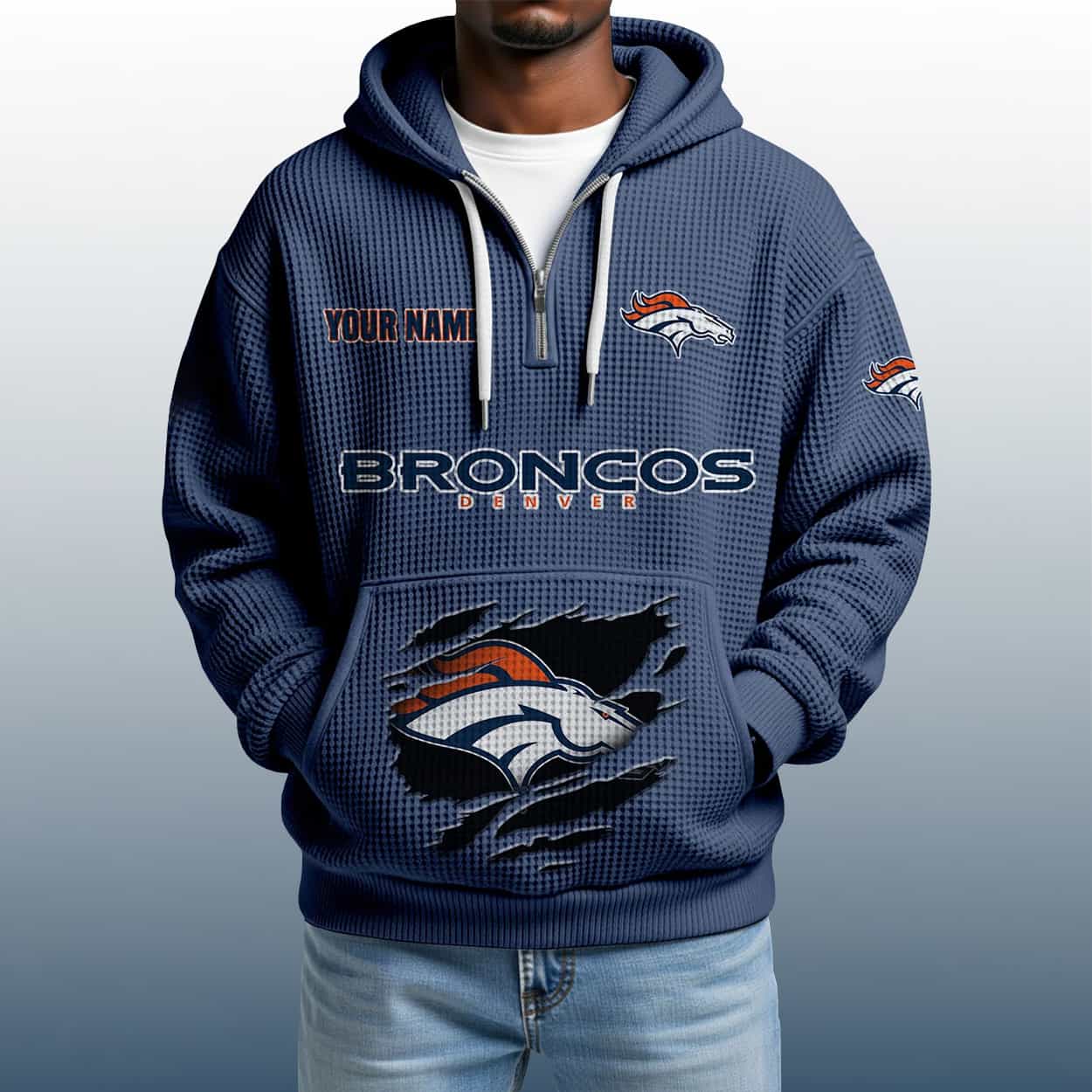Charge into 2025 with the 2025 Personalized Broncos Quarter Zip Waffle Hoodie—a bold, textured tribute to Denver pride with your name stitched into the legacy.