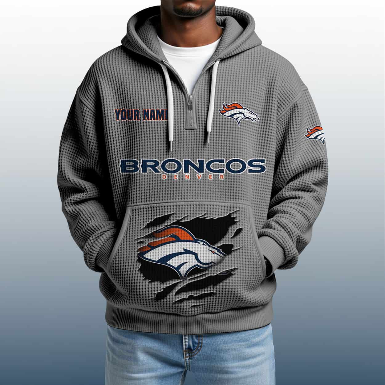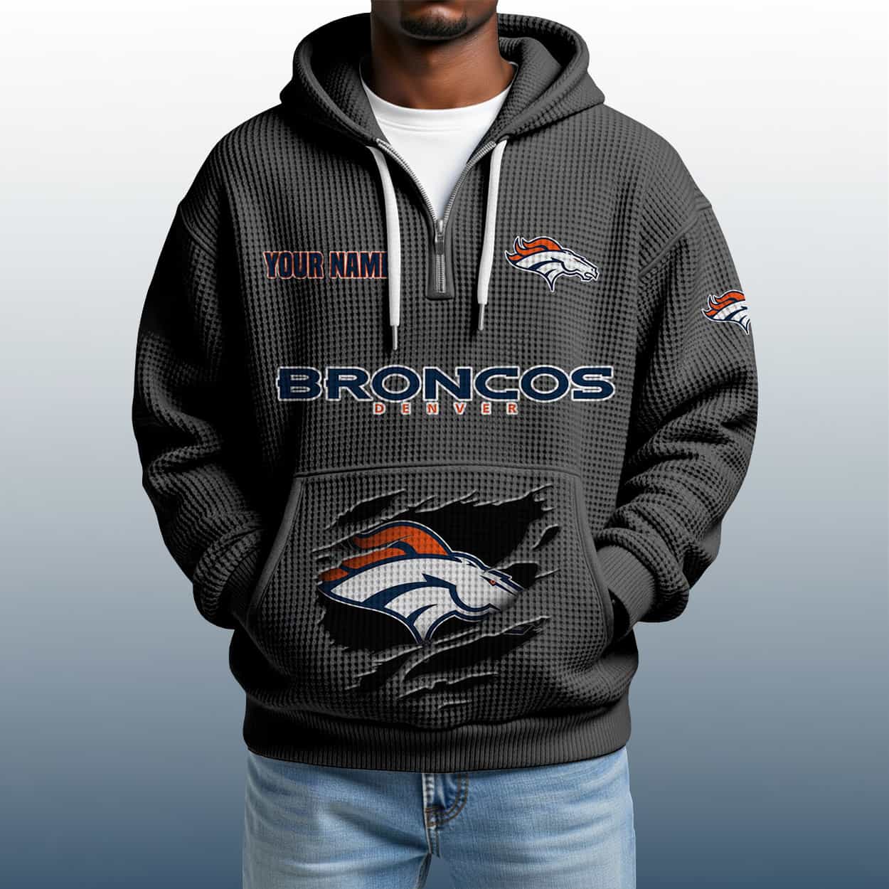 This hoodie isn’t just about repping the Broncos—it’s about owning your fandom. The textured waffle pattern adds depth and grit, while the personalized nameplate turns tradition into a bold fashion move. It’s designed for fans who don’t just follow—they lead, inspire, and bring the energy wherever they go. Whether you’re tailgating or tackling the day, this hoodie makes sure your loyalty is loud and clear.