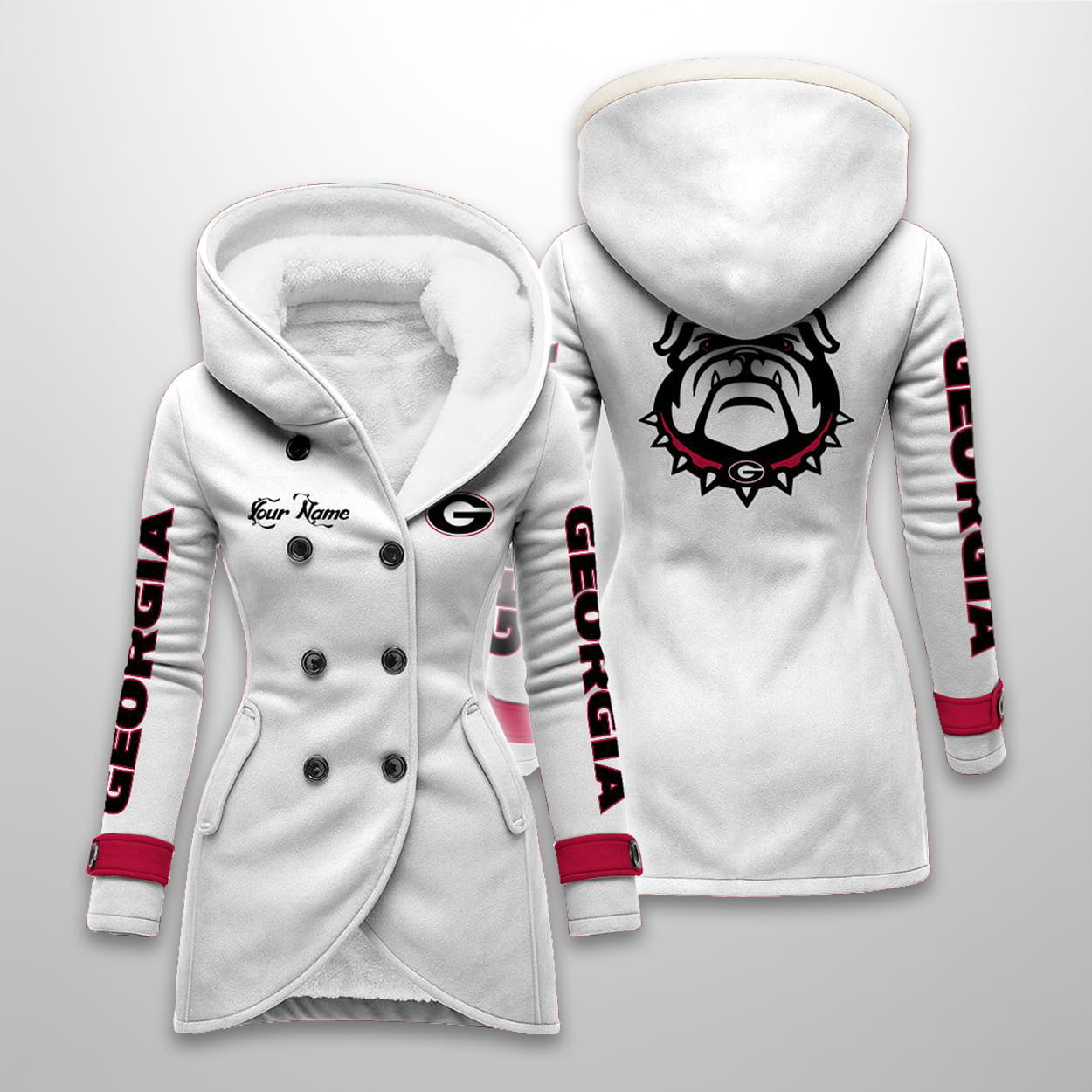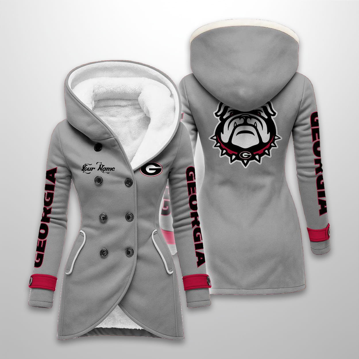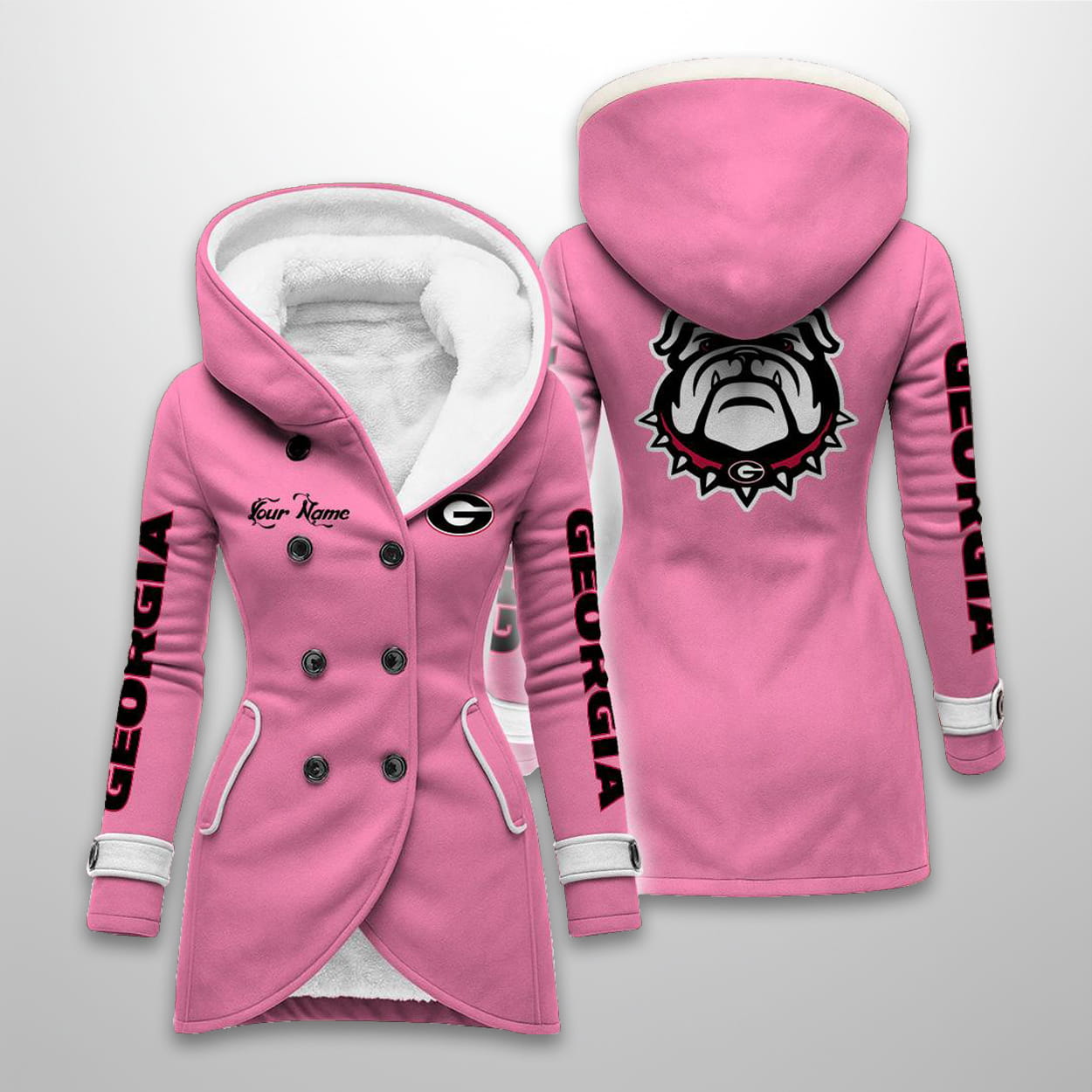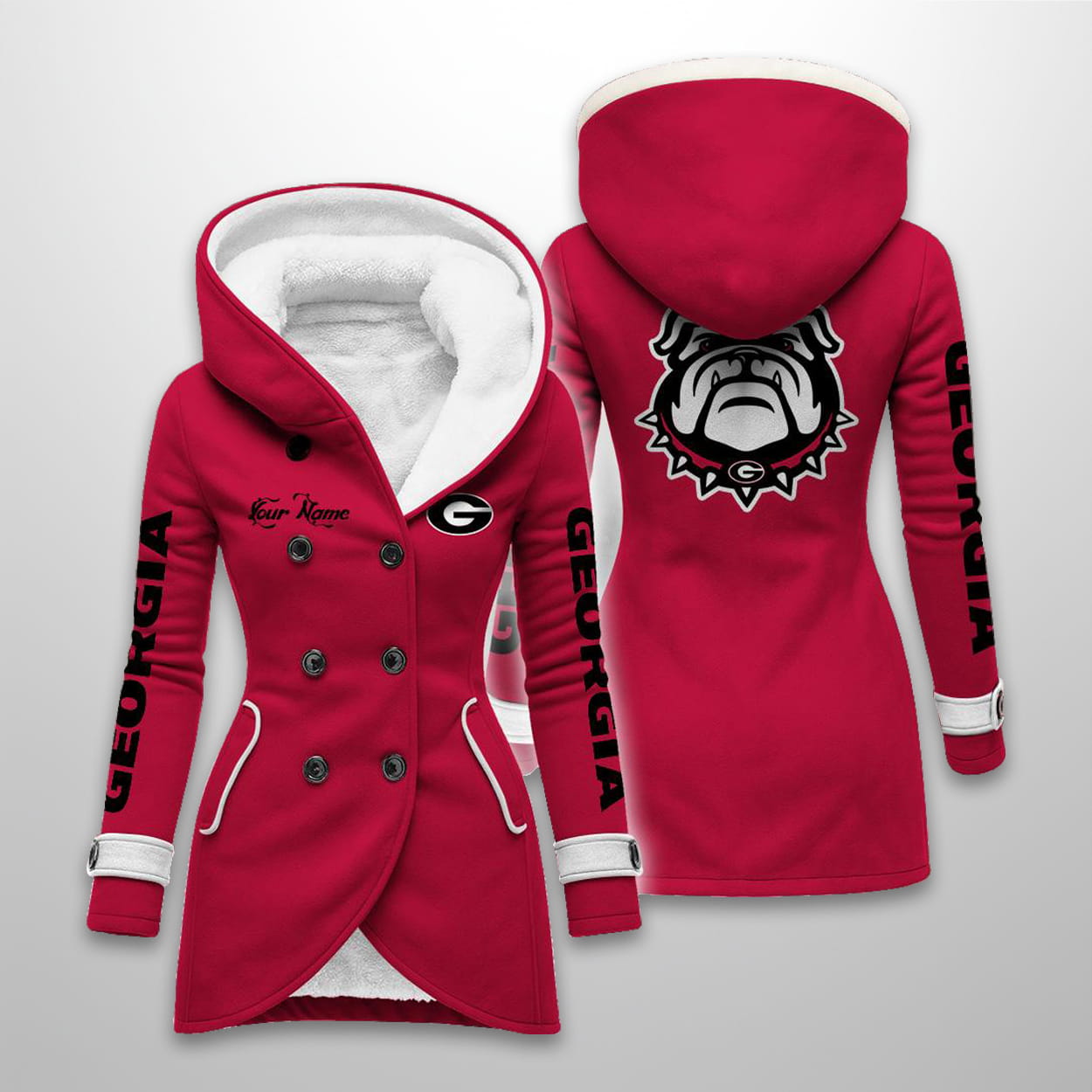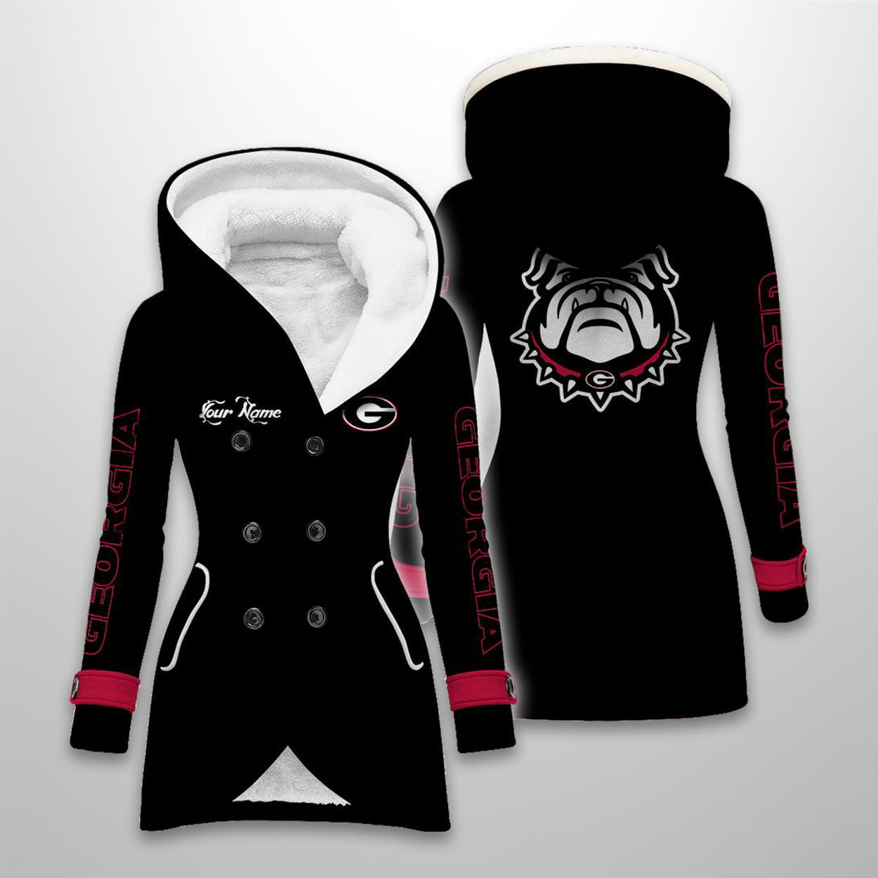 This long hooded fleece jacket is offered in five colors (including Red, White, Pink, Black, and Gray). The design features a large Bulldogs logo on the back and a smaller logo on the chest. The sleeves display vertical “BULLDOGS” text, and the coat includes a double-breasted button front and a plush sherpa-lined interior for superior warmth. It also features an area for personalization labeled “Your Name”.