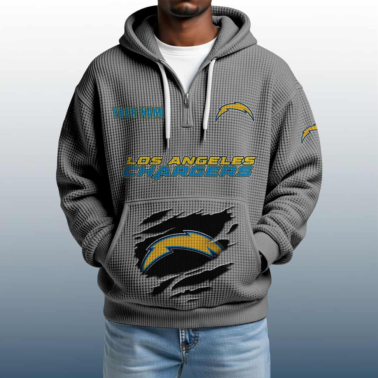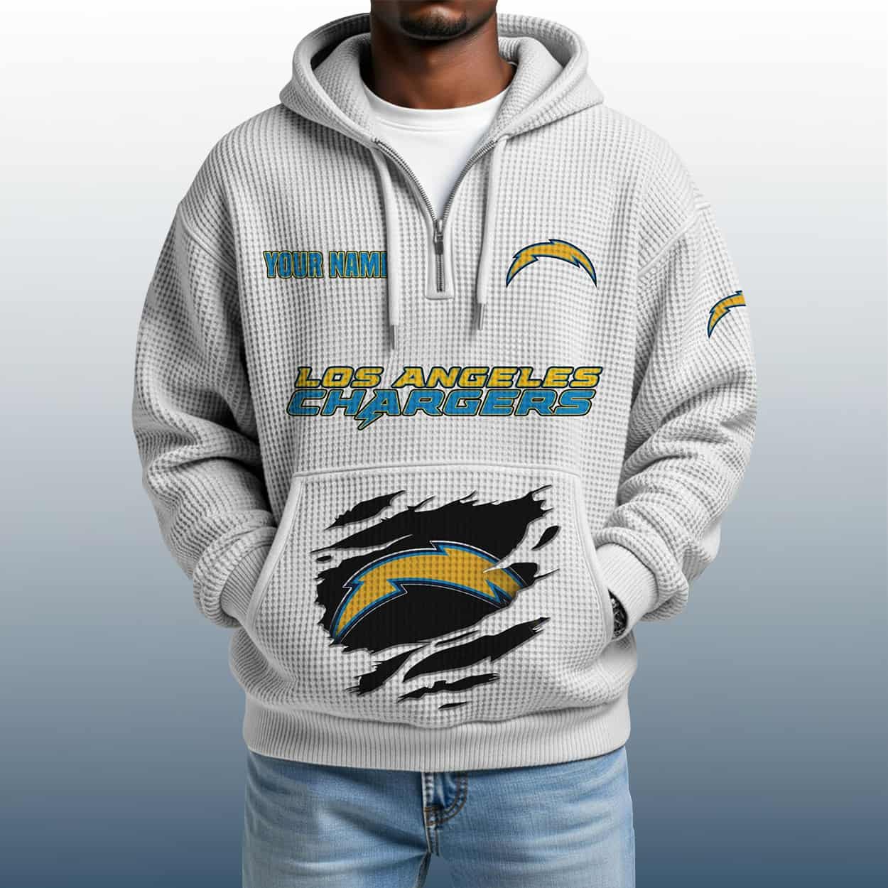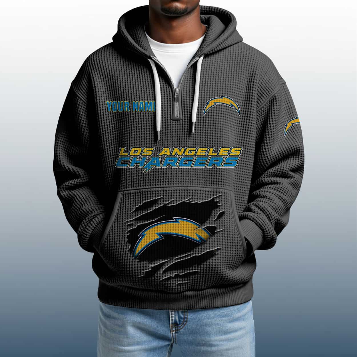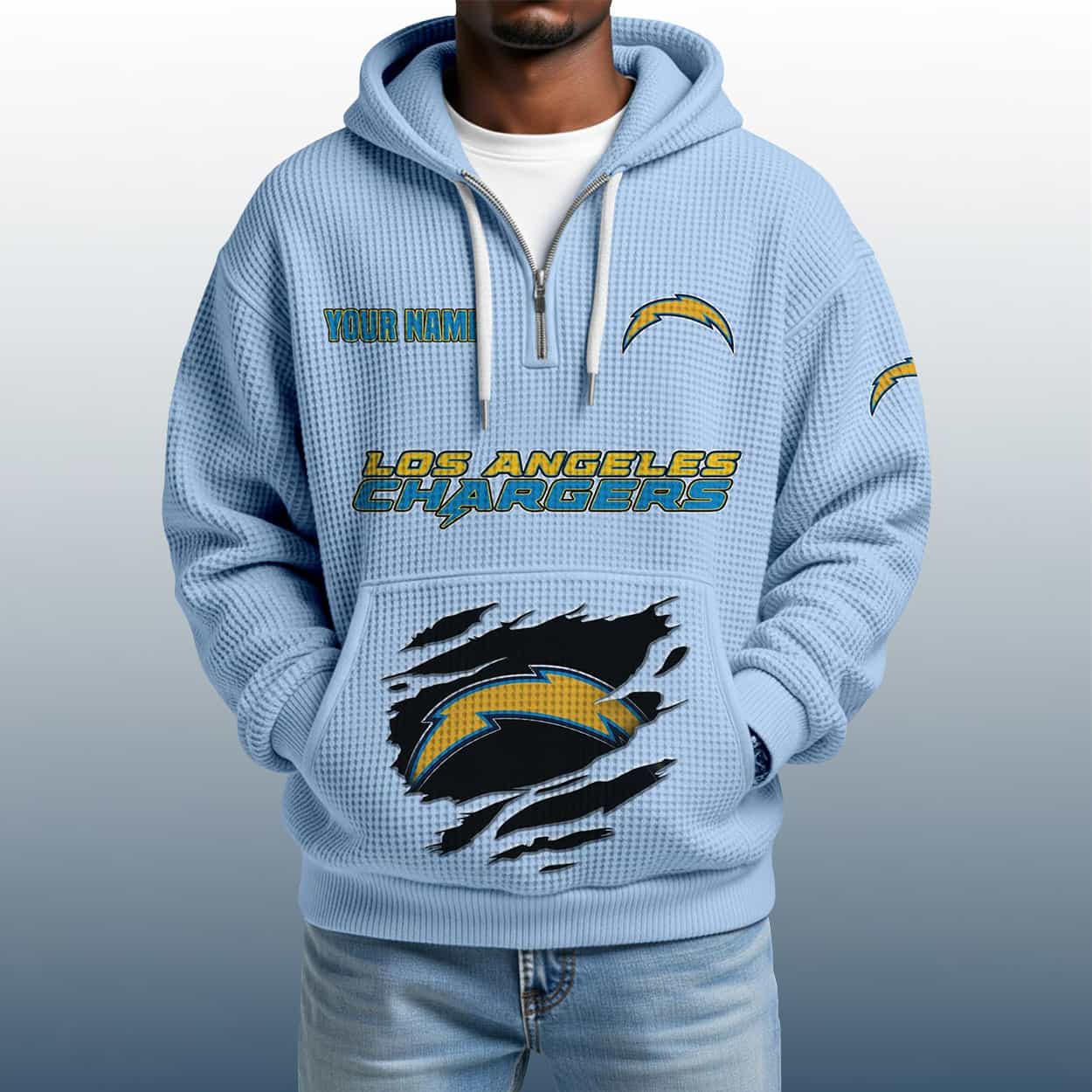 Electrify your fan gear with the 2025 Personalized Chargers Quarter Zip Waffle Hoodie—customized, textured, and built for bold Bolts believers.