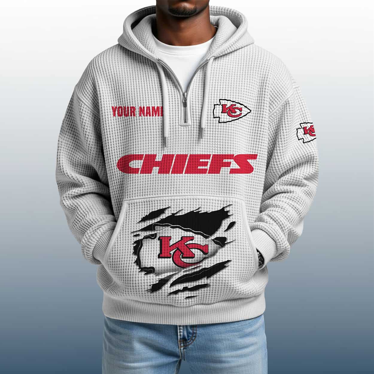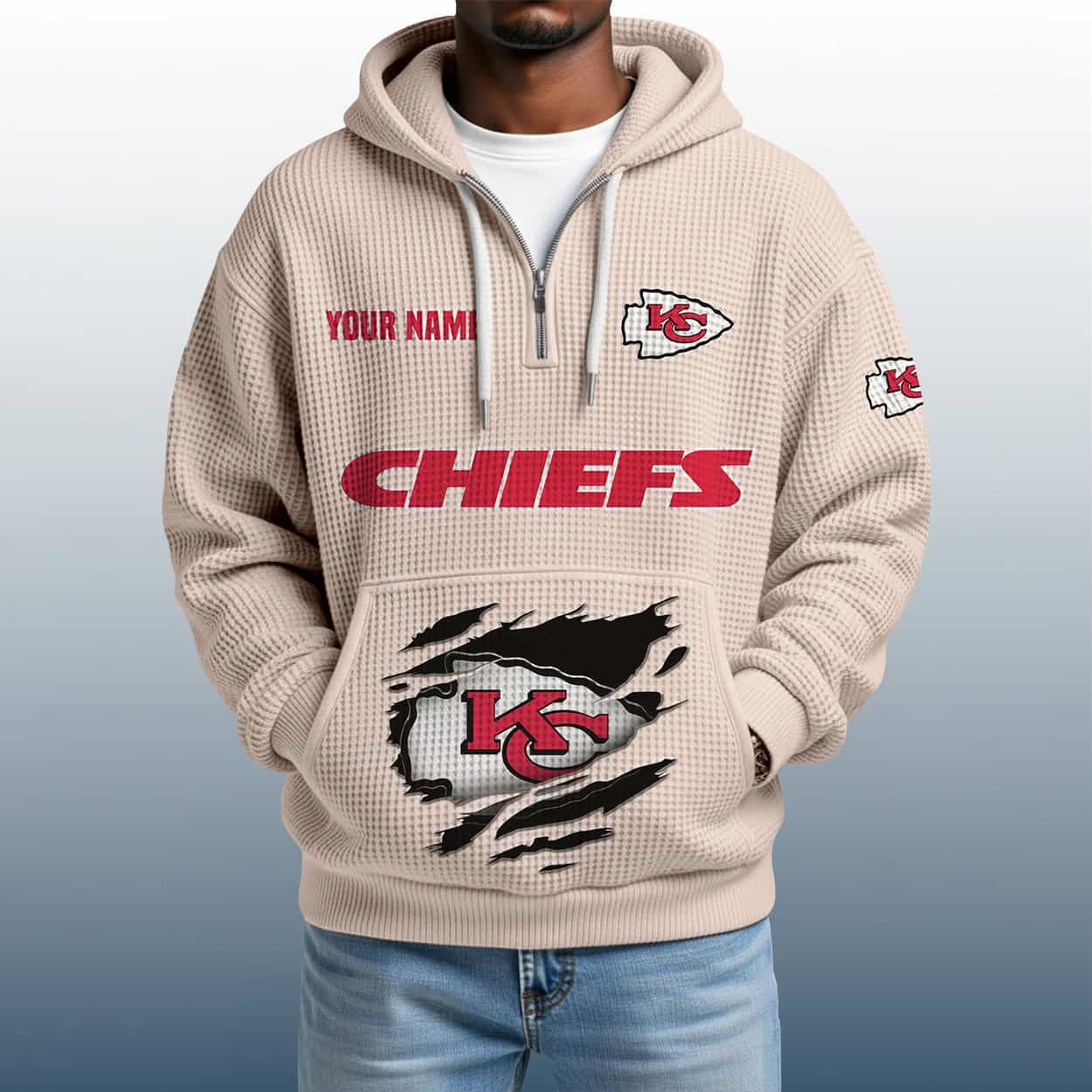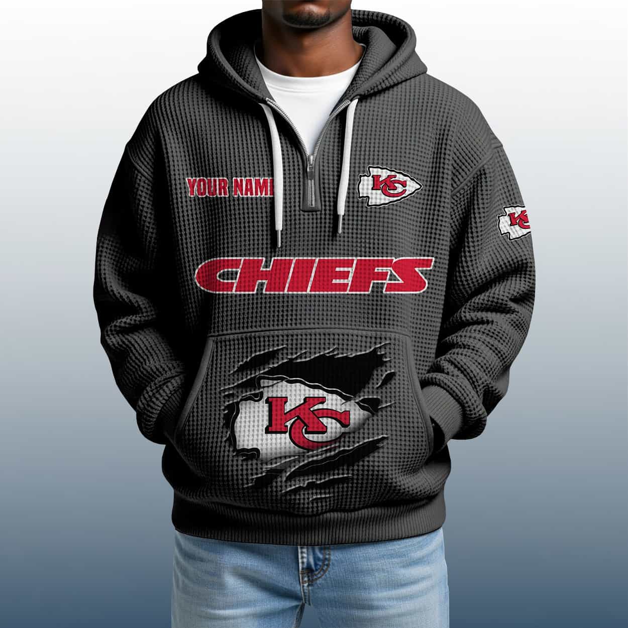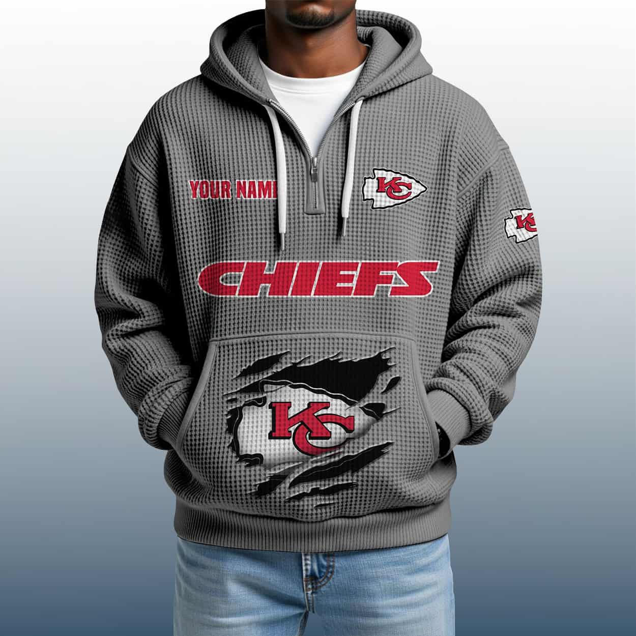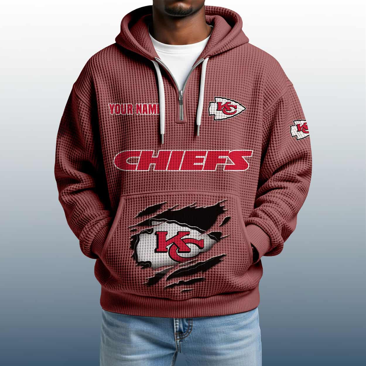 This hoodie is a maroon marvel built for fans who want their name in the game. On the left chest, “YOUR NAME” is stitched in bold red above the iconic arrowhead logo—because this hoodie is all about personal pride. Across the chest, “CHIEFS” roars in oversized red lettering, while the right sleeve keeps the energy alive with another Chiefs logo. The lower front features a dramatic torn graphic revealing the team’s emblem, adding a gritty, battle-ready vibe. With a textured finish and a quarter zip for easy wear, this hoodie is perfect for tailgates, touchdowns, and everyday swagger.