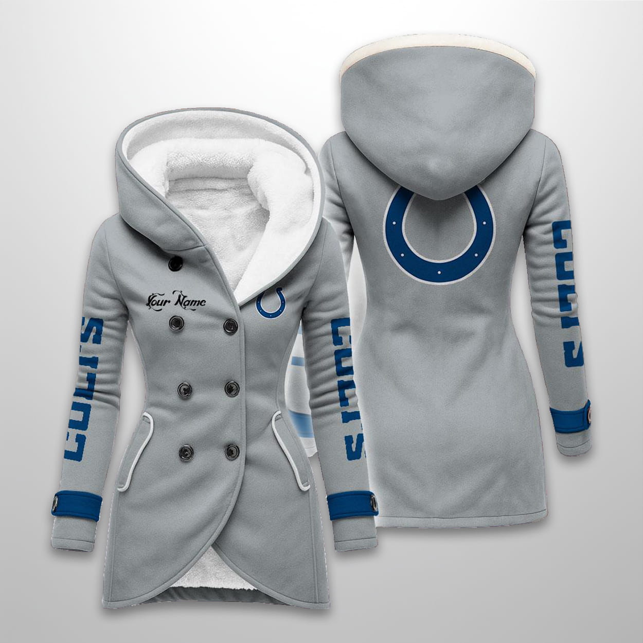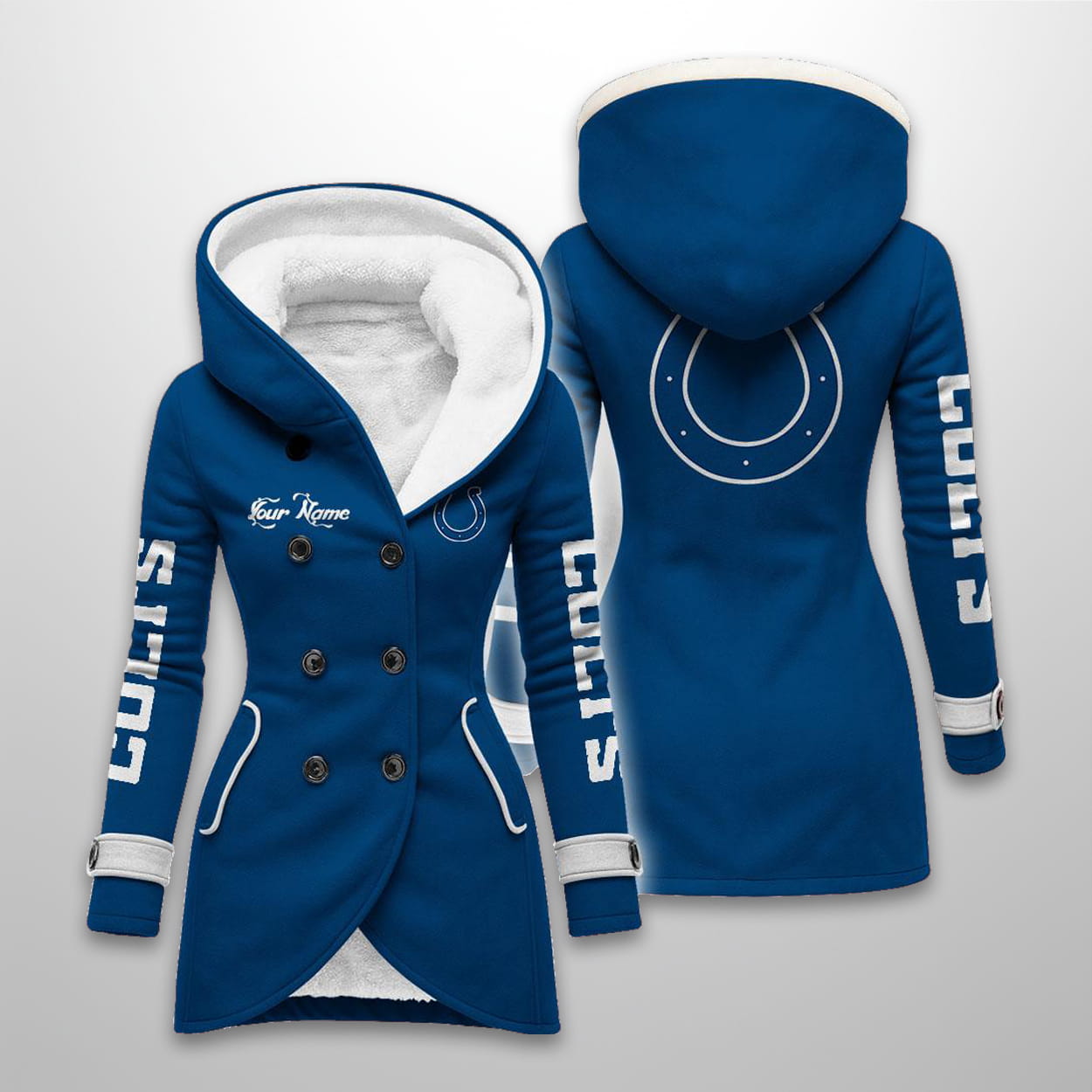 This long hooded fleece jacket is offered in five colors (including Blue, Black, Pink, White, and Gray). The design features the Indianapolis Colts Horseshoe logo prominently on the back and a smaller logo on the chest. The sleeves display vertical “COLTS” text, and the coat includes a double-breasted button front and a plush sherpa-lined interior for superior warmth. It also features an area for personalization labeled “Your Name”.