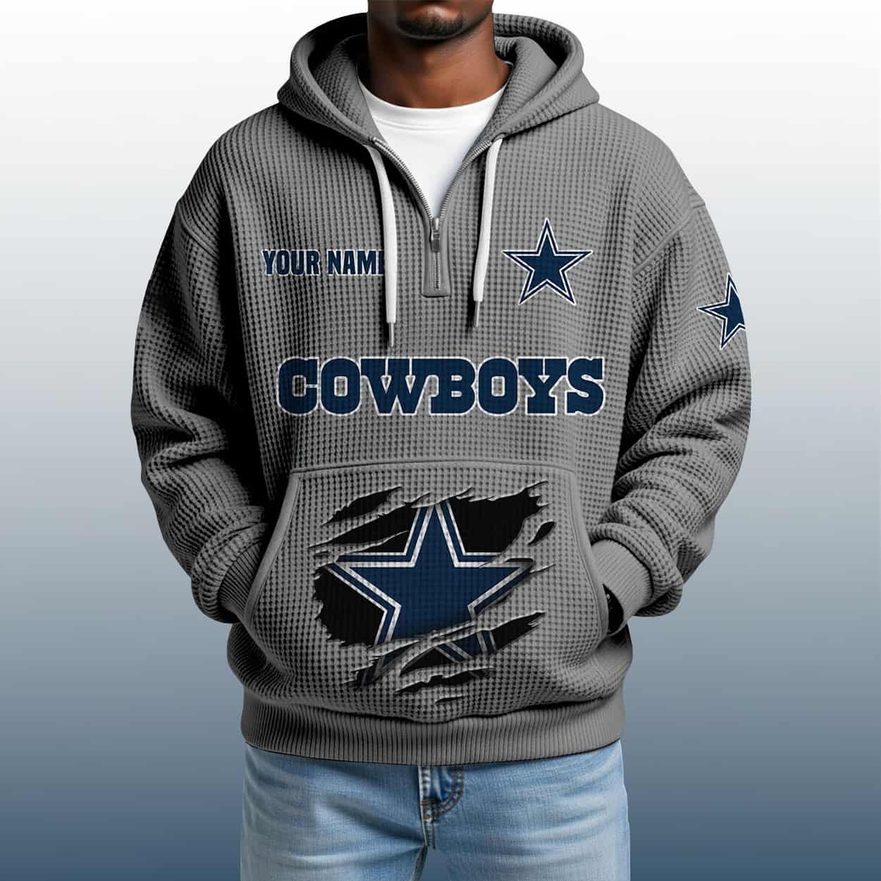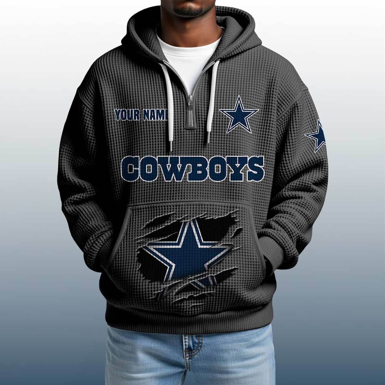 Ready to ride with the star in style? The 2025 Personalized Cowboys Quarter Zip Waffle Hoodie is your chance to stand out while standing up for your team. Zip in, show off, and let your name shine with Dallas pride!