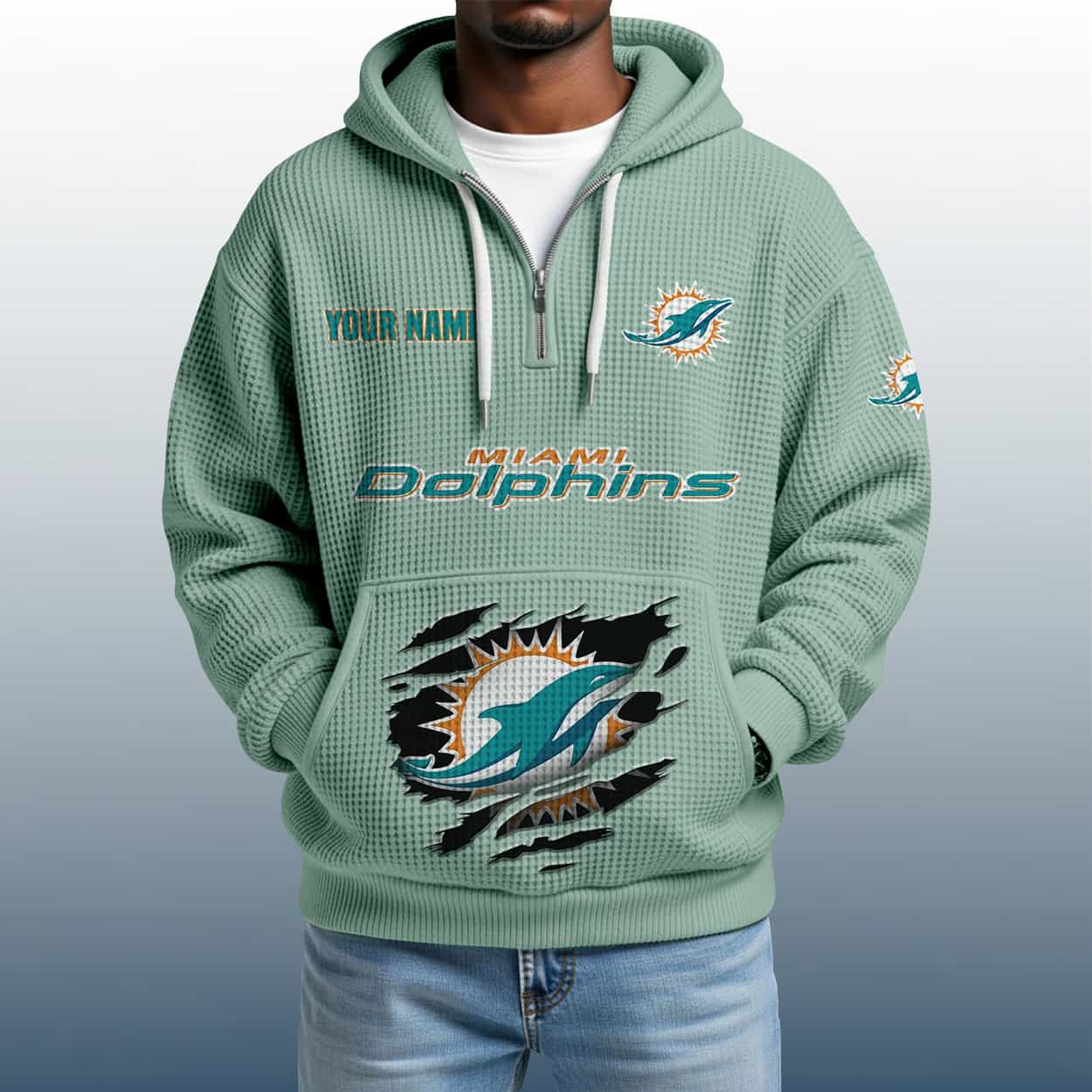 This hoodie is a seafoam green stunner built for fans who want to stand out. On the left chest, “YOUR NAME” is printed in bold lettering just above the classic Dolphins logo, making this hoodie uniquely yours. Across the chest, “DOLPHINS” bursts in vibrant orange and teal, while the front pocket showcases a dramatic torn graphic revealing the team’s emblem in full glory. The left sleeve carries another Dolphins logo, adding extra splash to your sideline swagger. With a textured finish and a quarter zip for easy wear, this hoodie is perfect for breezy beach days, tailgates, or just flexing your fandom.