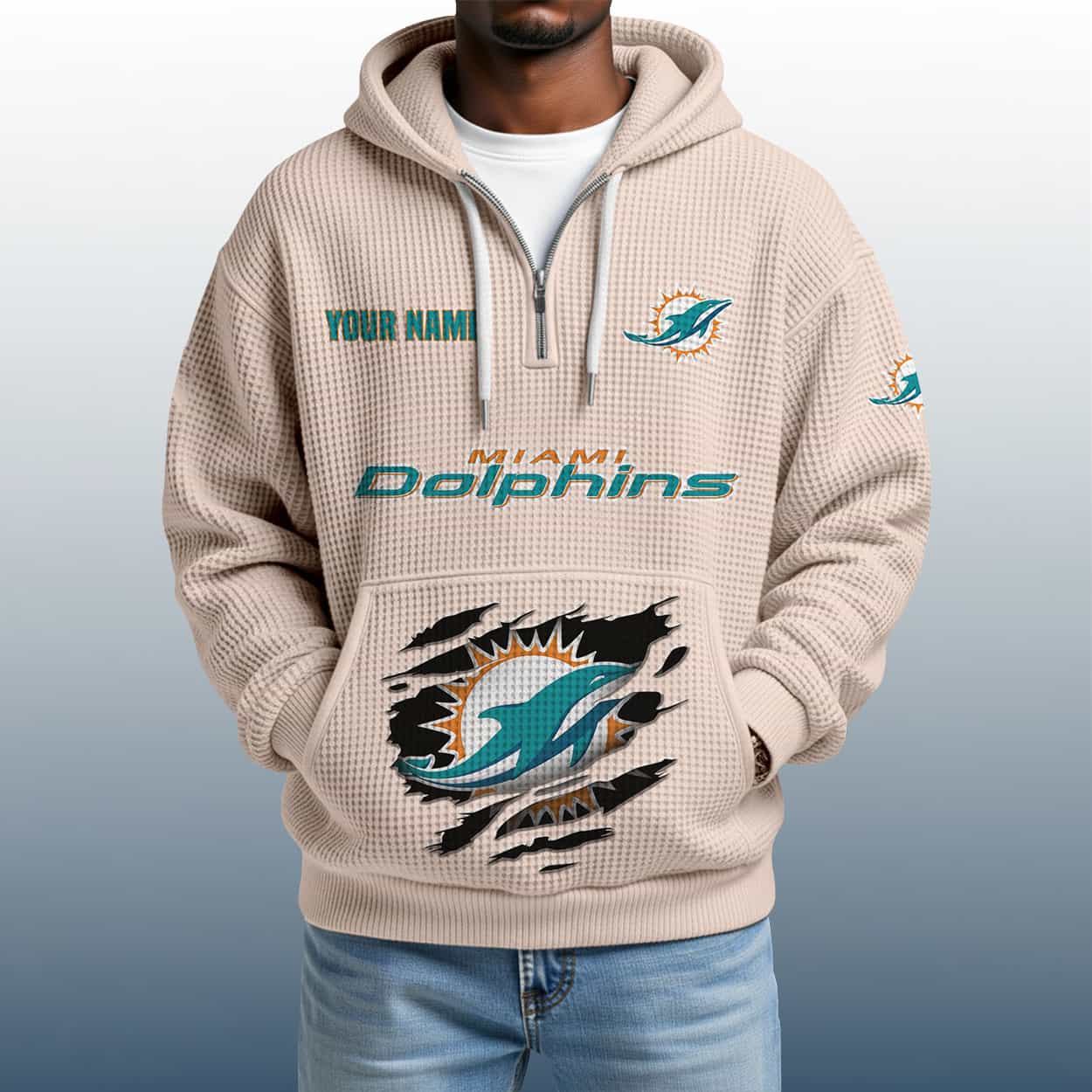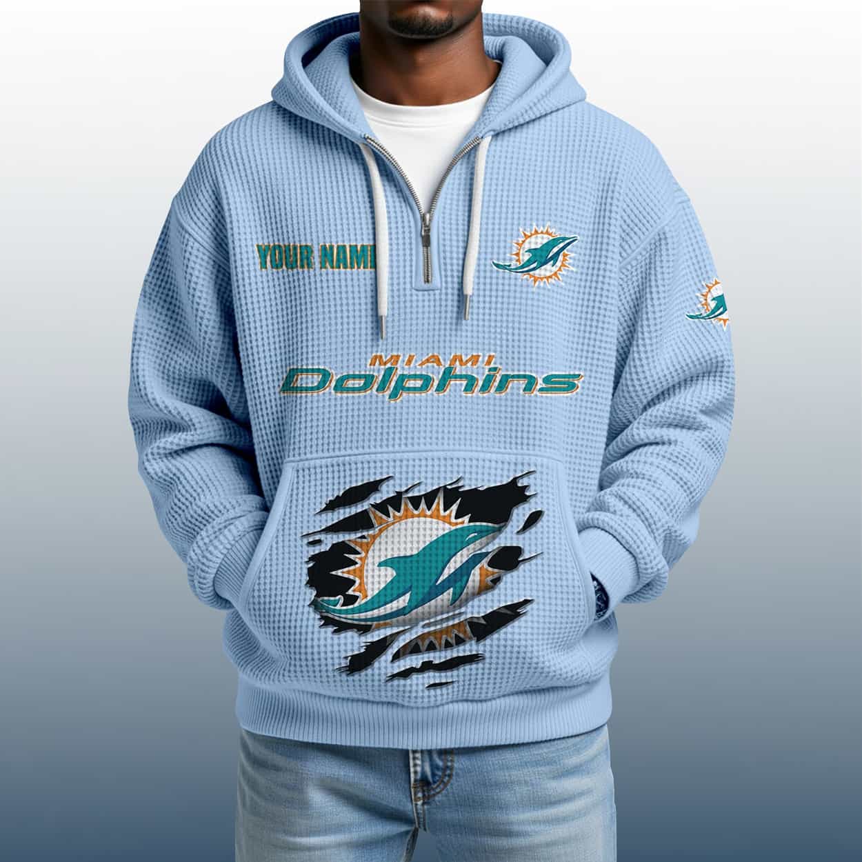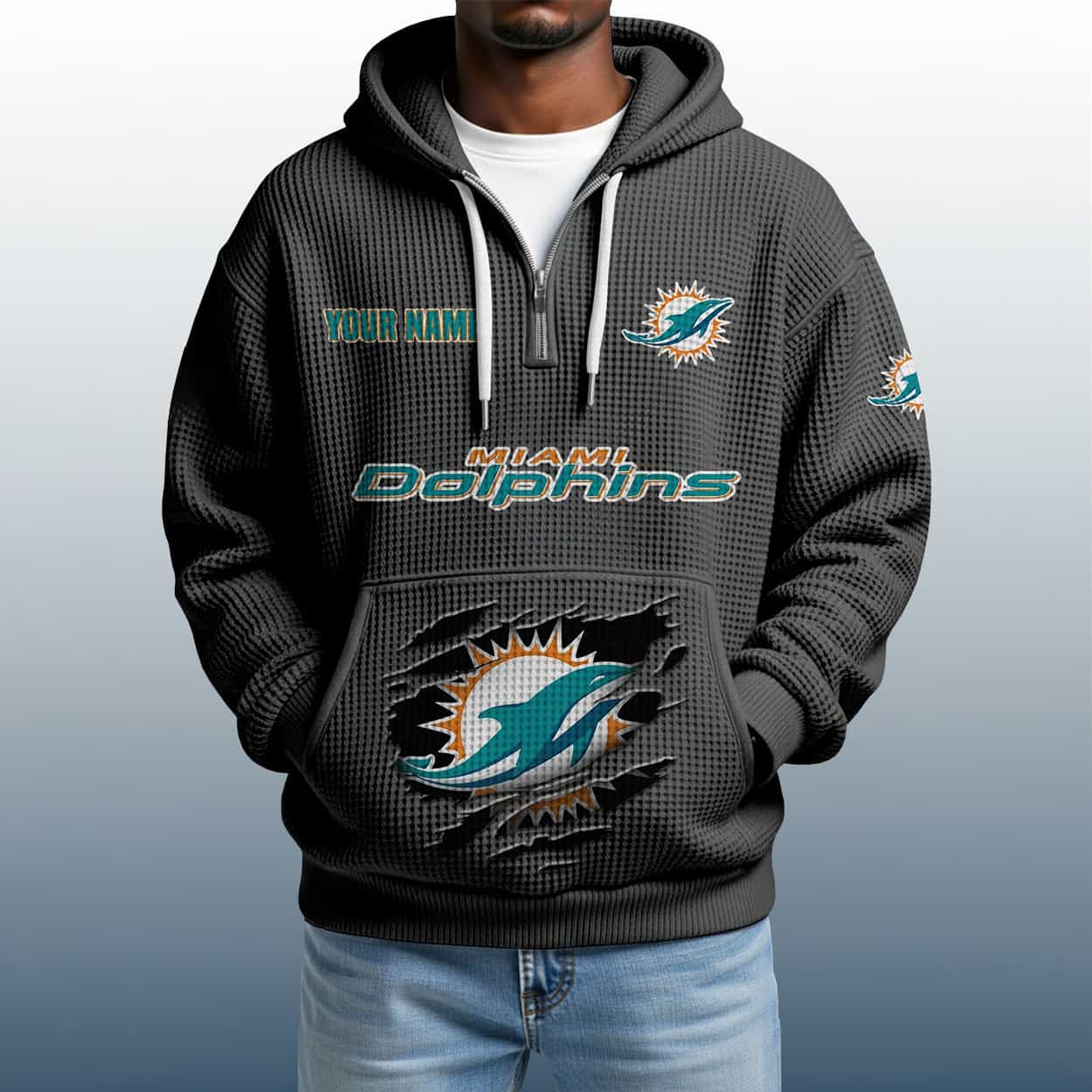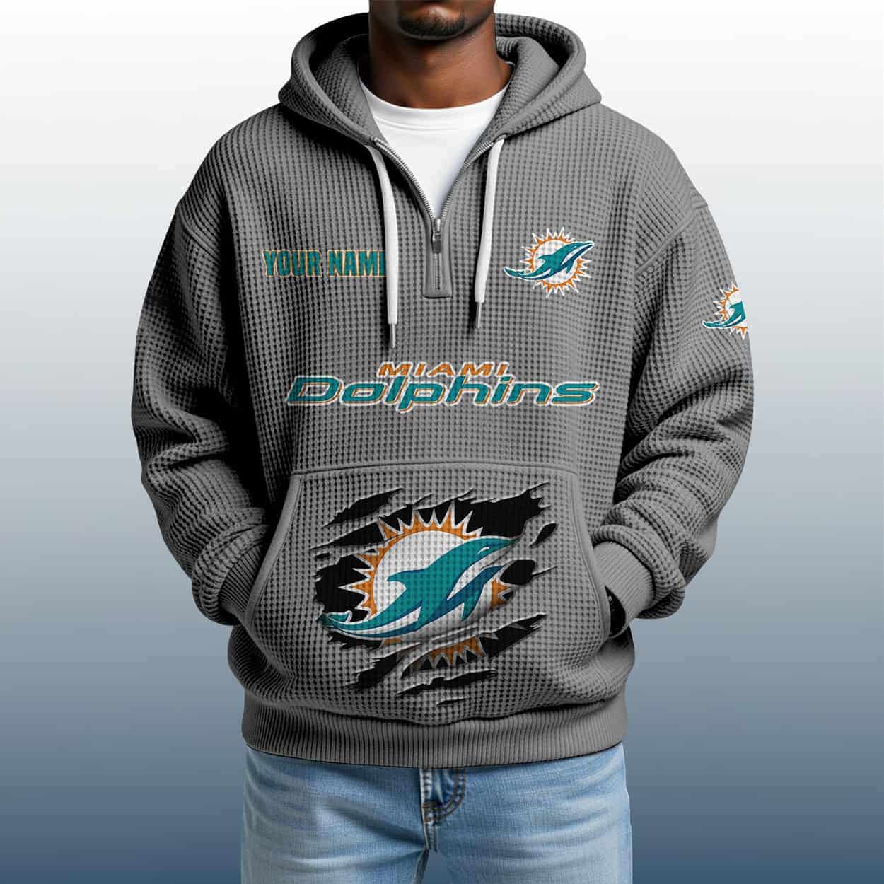 Make waves with the 2025 Personalized Dolphins Quarter Zip Waffle Hoodie—where custom flair meets Miami fan fire. A bold essential for every Dolphins devotee.