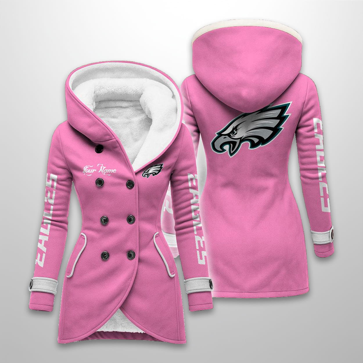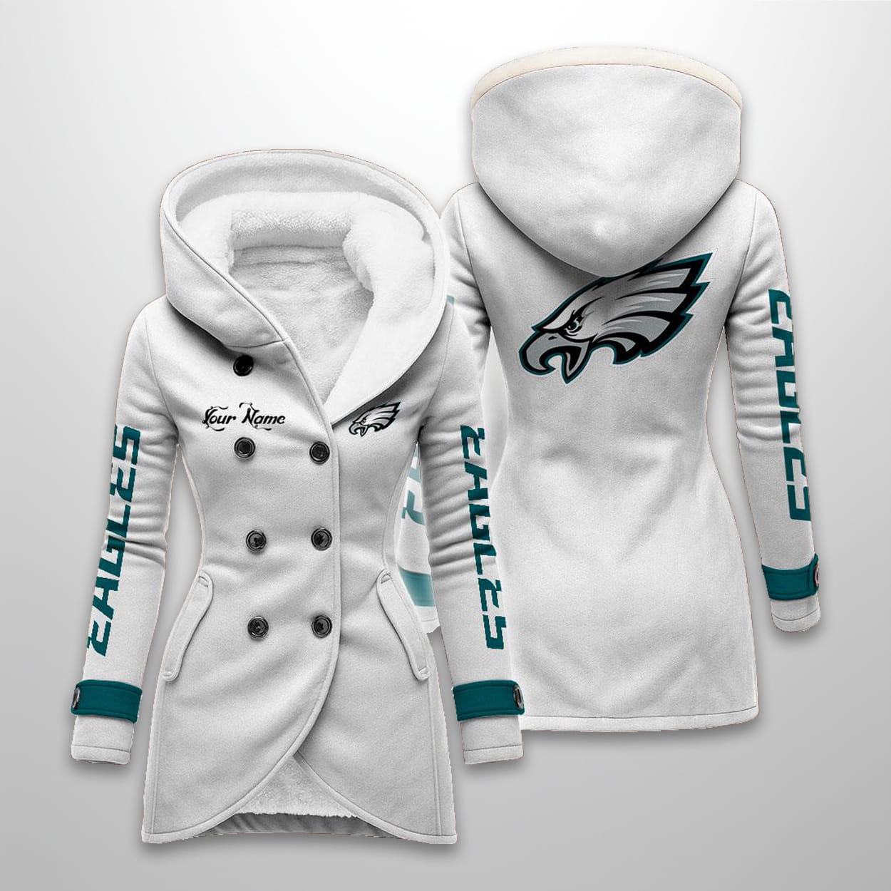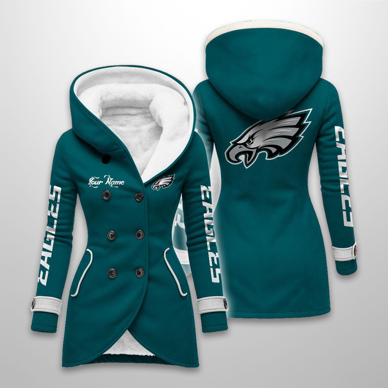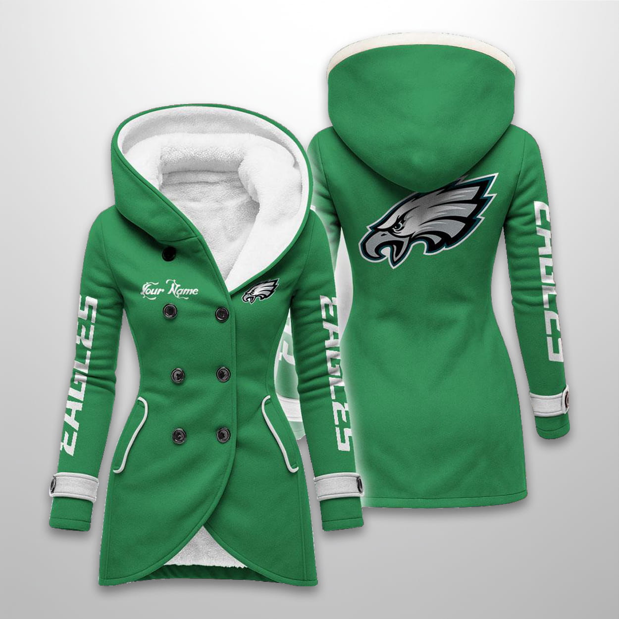 This long hooded fleece jacket is available in five colors: Black, White, Pink, Kelly Green, and Green. The design features an oversized Eagles logo on the back and a smaller logo on the chest. The sleeves boast vertical “EAGLES” text, and the coat includes a double-breasted button front and a plush sherpa-lined hood and interior. It includes an area for personalization labeled “Your Name”.