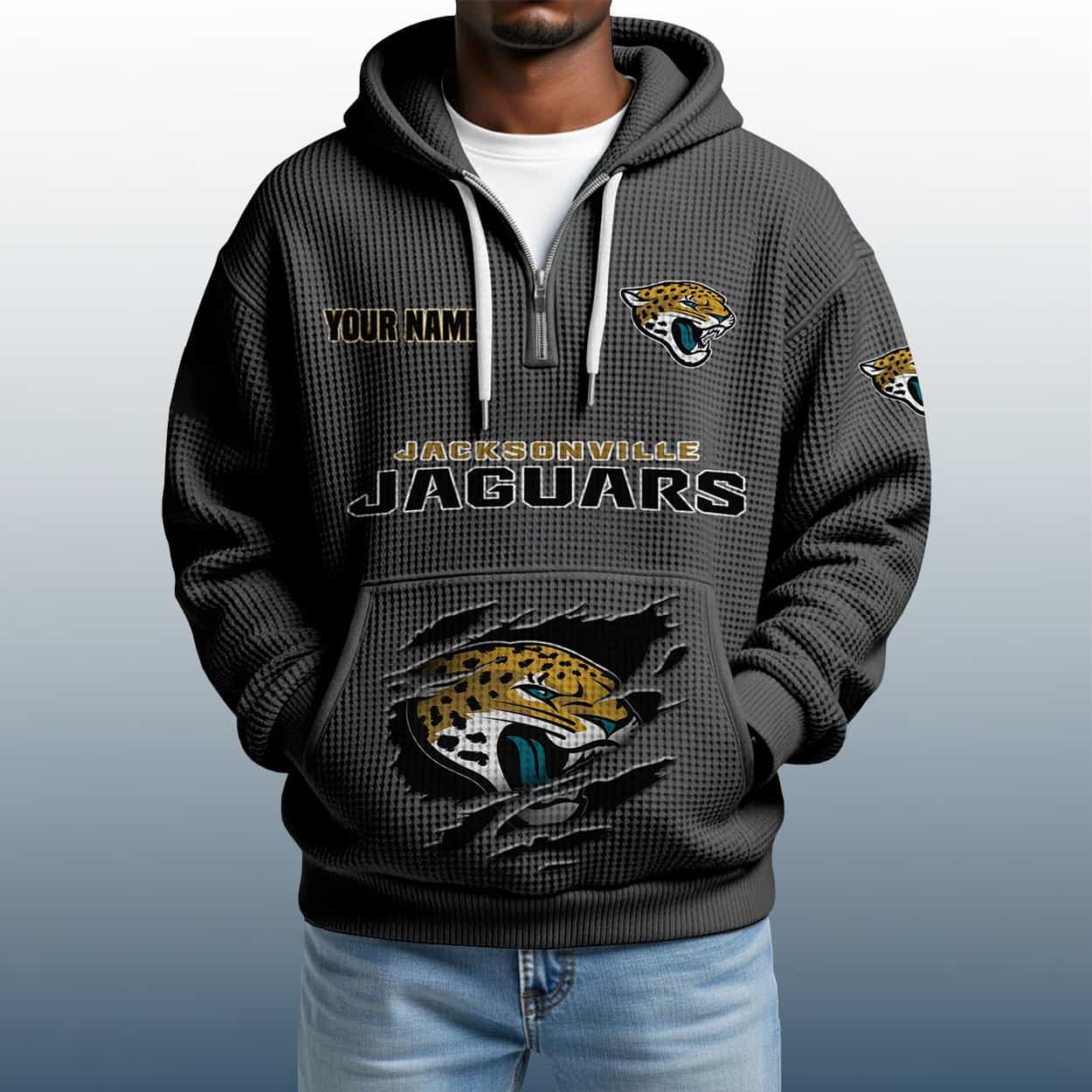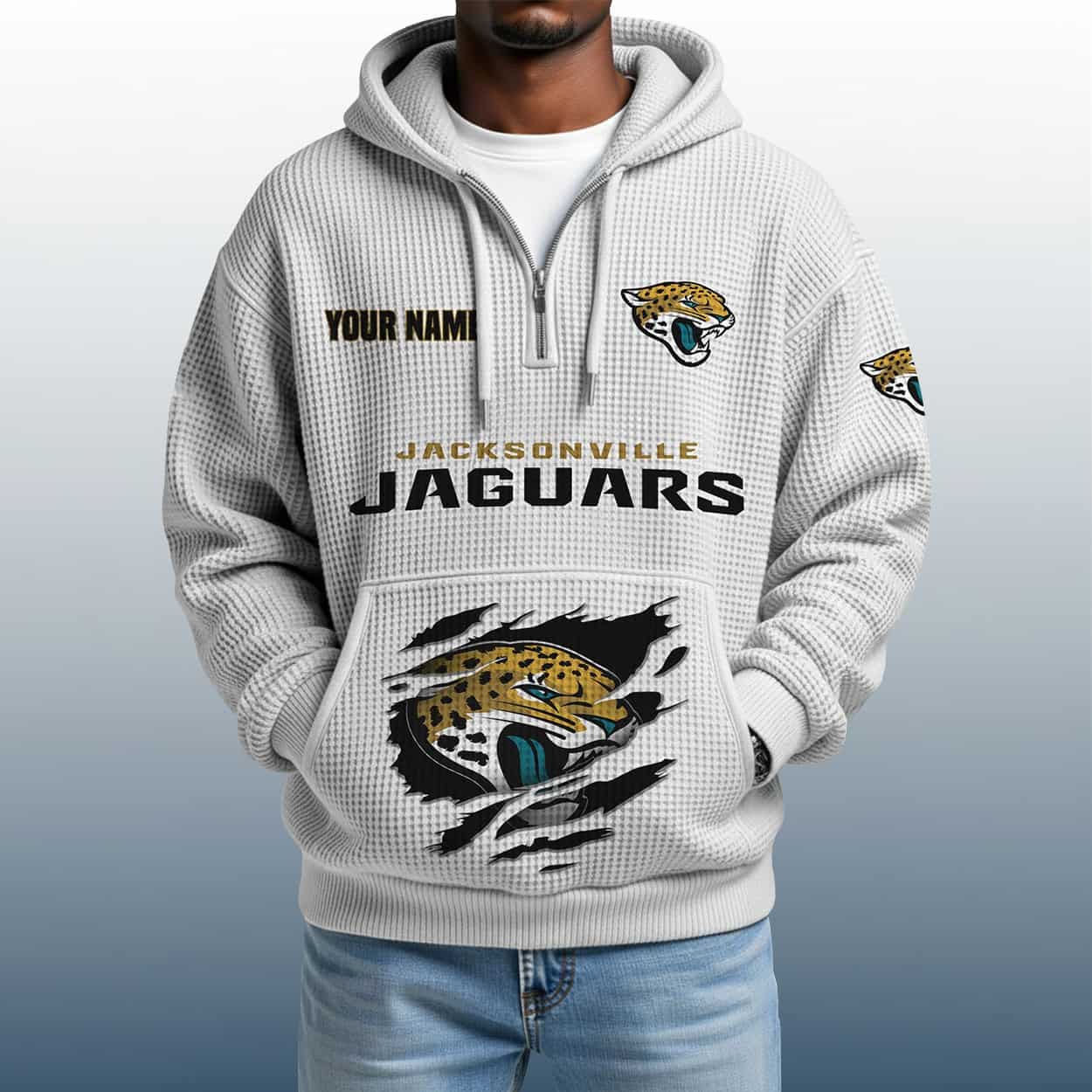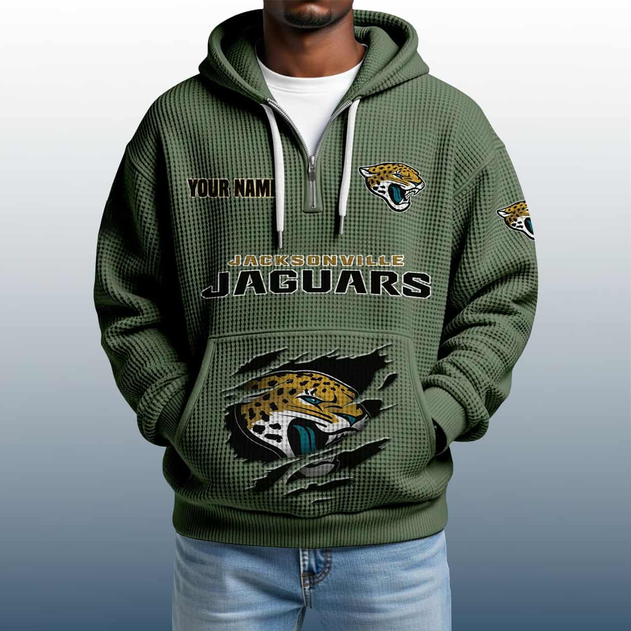 Unleash your inner Jaguars with the 2025 Personalized Jaguars Quarter Zip Waffle Hoodie—where fierce style meets fan pride. Customizable, bold, and built to turn heads.