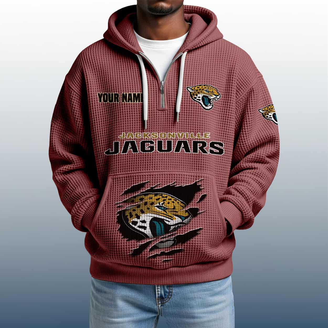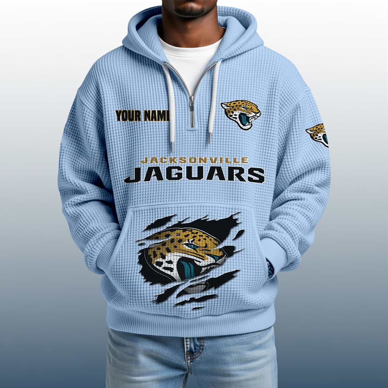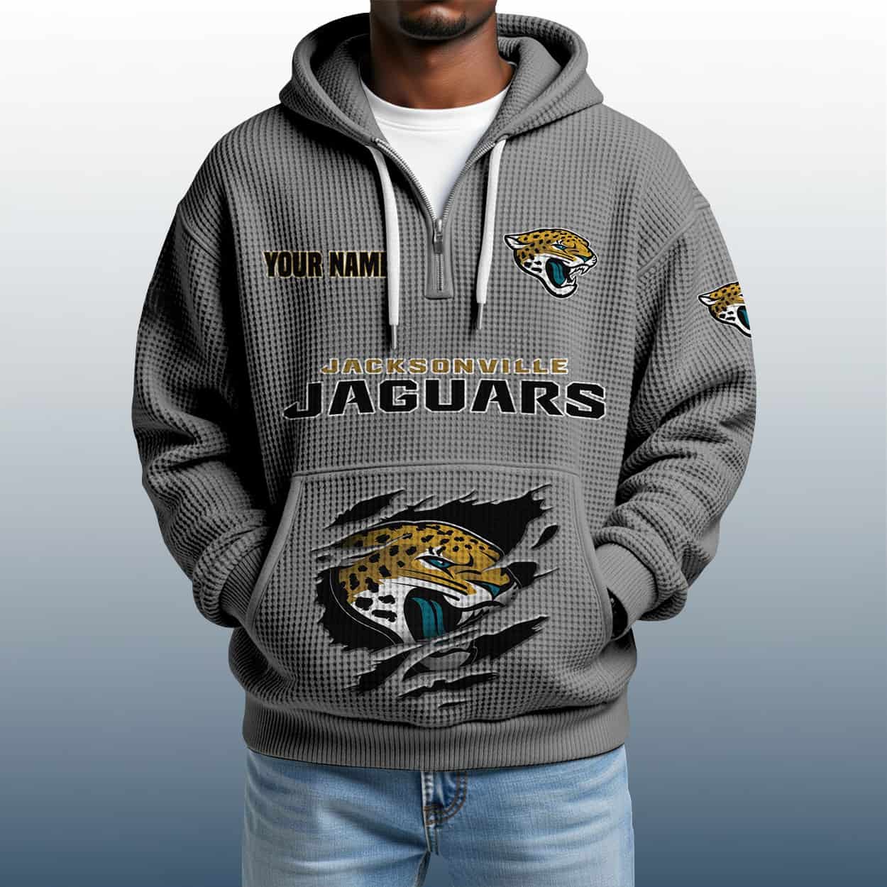 Unleash your inner Jaguars with the 2025 Personalized Jaguars Quarter Zip Waffle Hoodie—where fierce style meets fan pride. Customizable, bold, and built to turn heads.