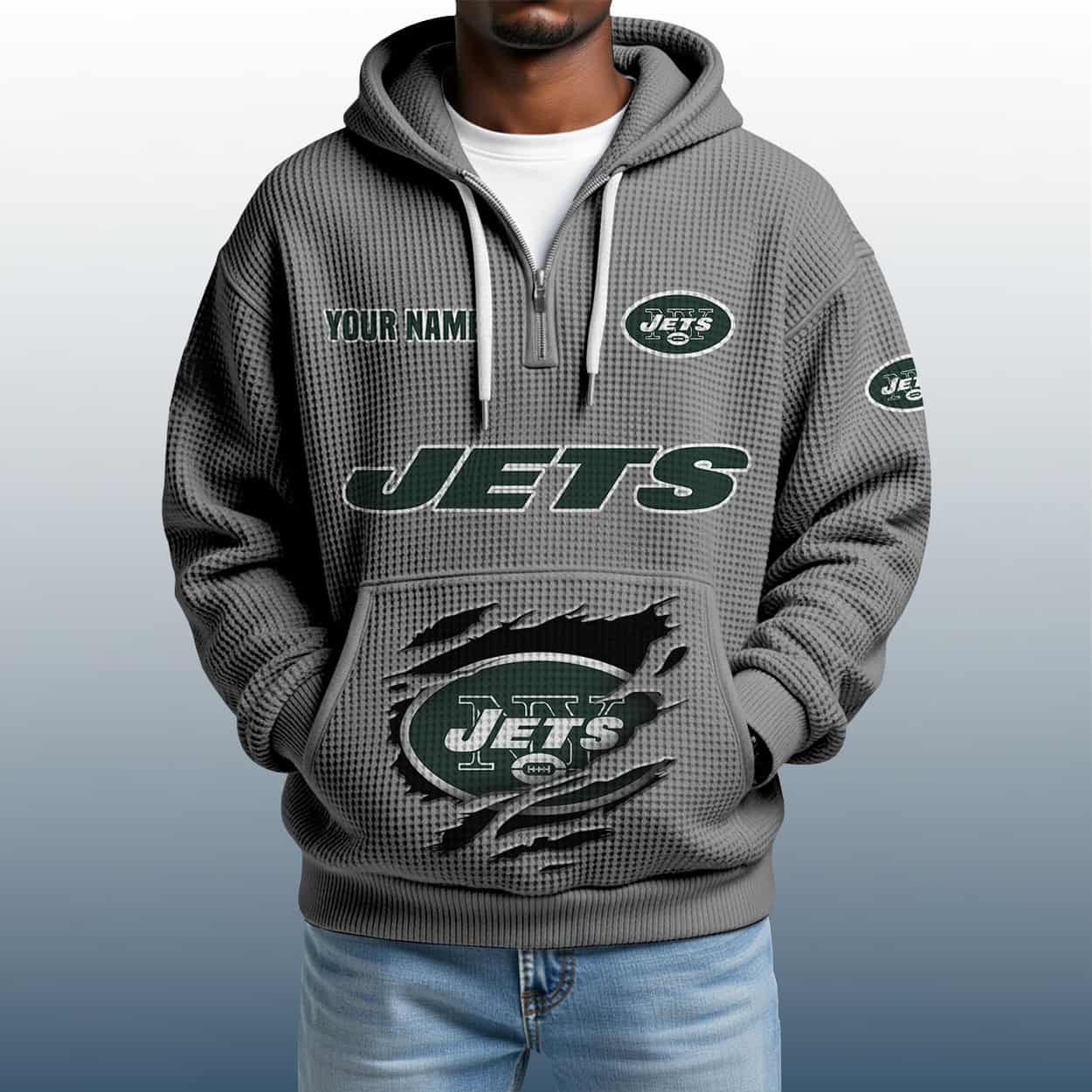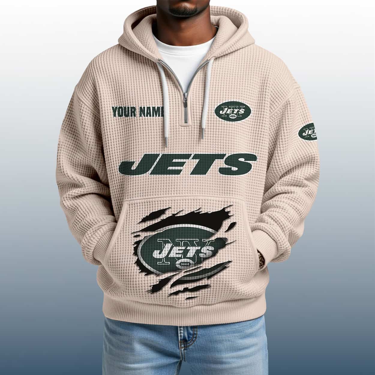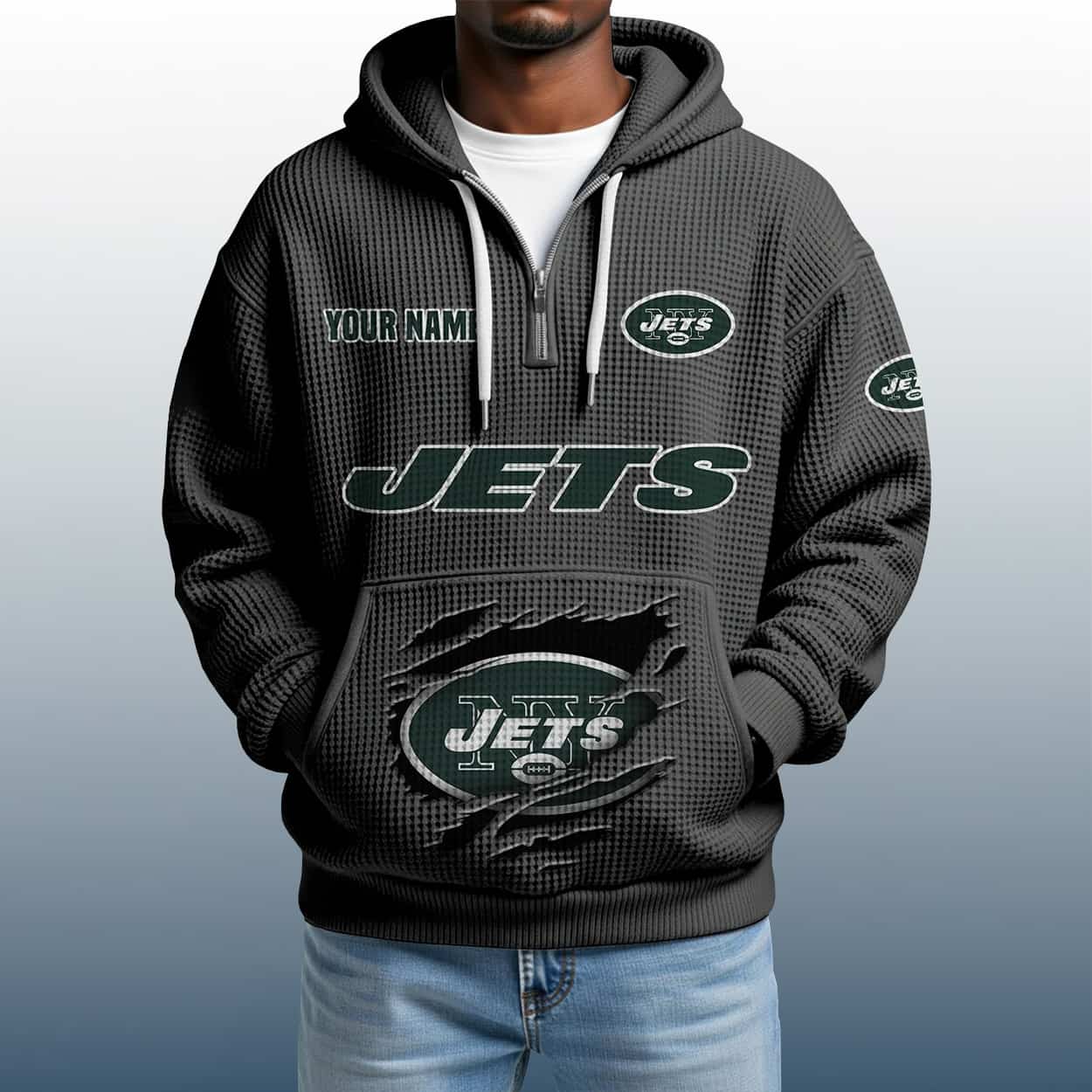 Make a bold play with the 2025 Personalized Jets Quarter Zip Waffle Hoodie—where fan pride meets standout style. Customize your name and rep the New York Jets with flair.