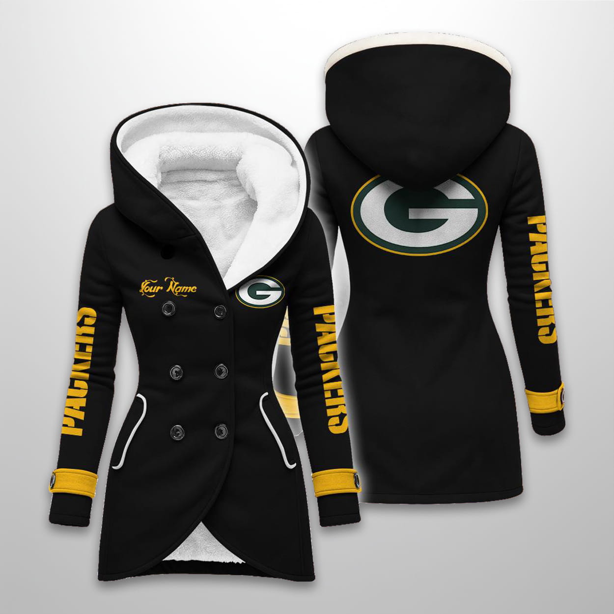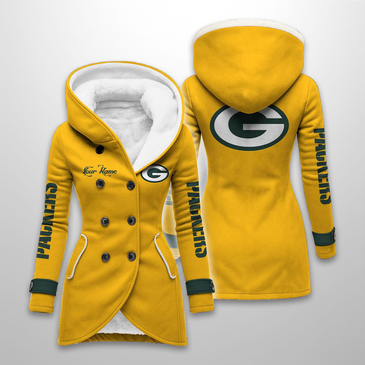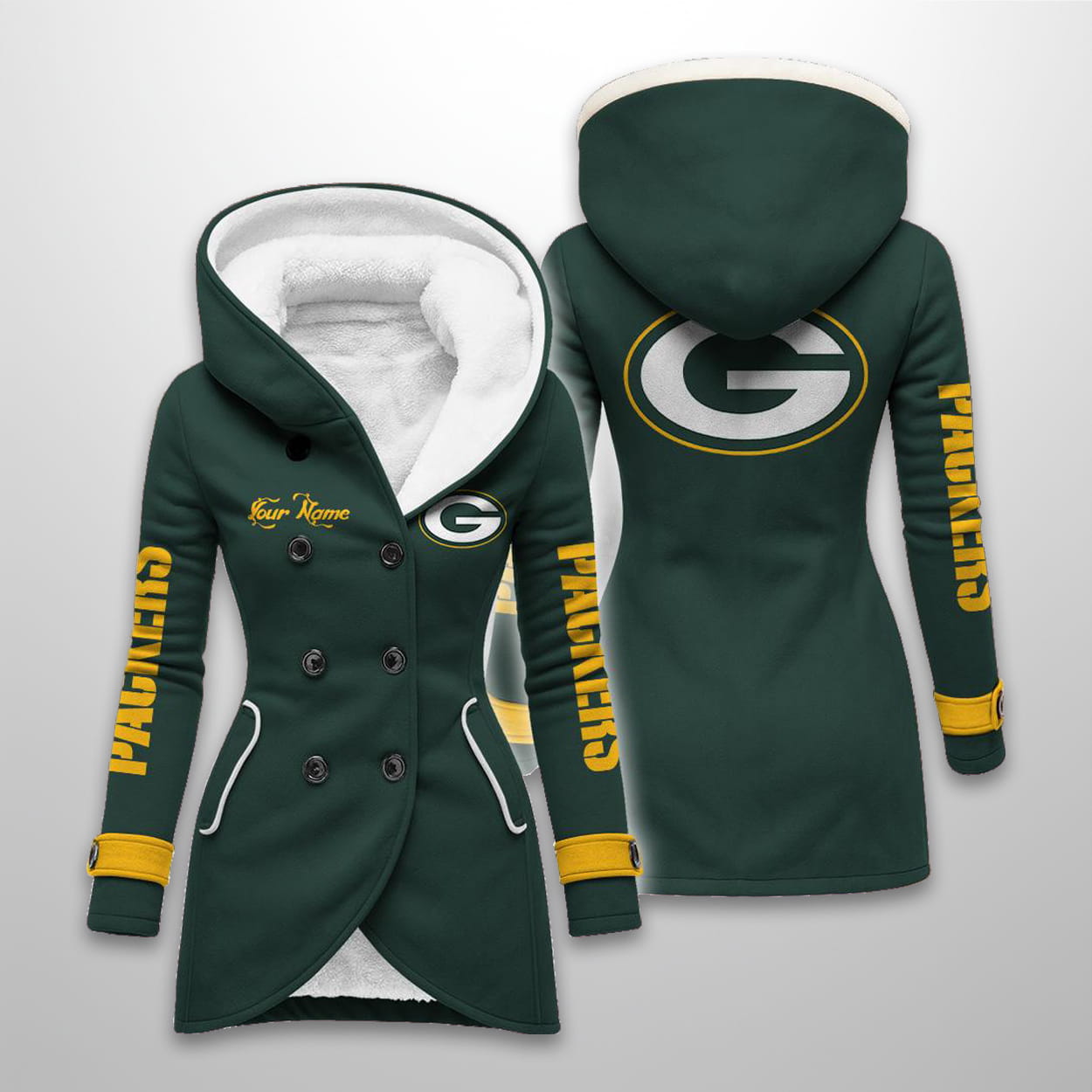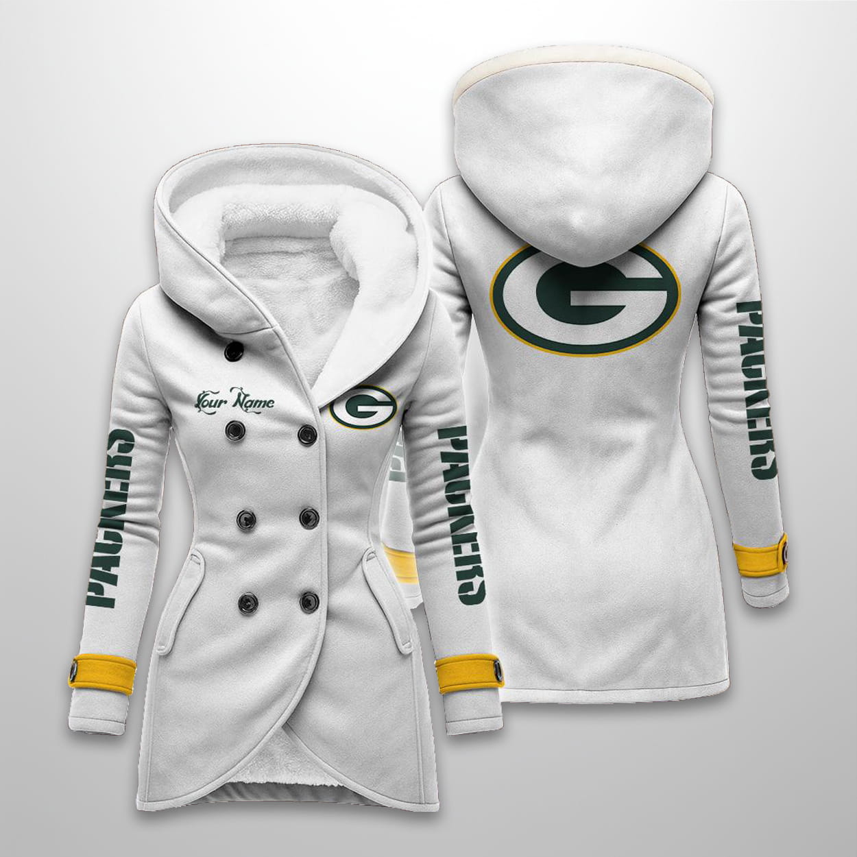 This long hooded fleece jacket is offered in five colors (including Green, White, Pink, Black, and Gray). The design features the classic Green Bay ‘G’ logo prominently on the back and a smaller ‘G’ on the chest. The sleeves display bold, vertical “PACKERS” text, and the coat includes a double-breasted button front and a plush sherpa-lined interior for superior warmth. It also includes an area for personalization labeled “Your Name”.