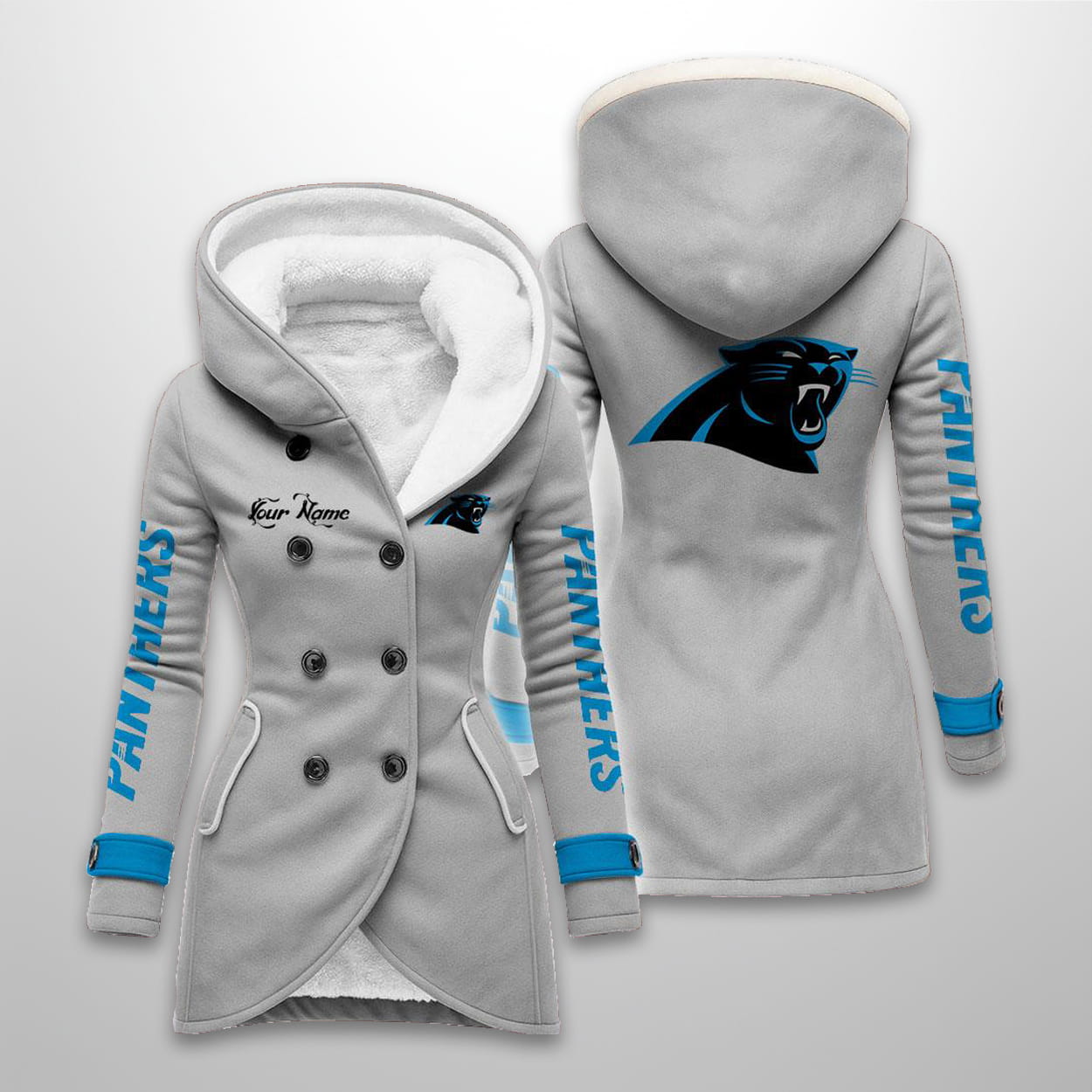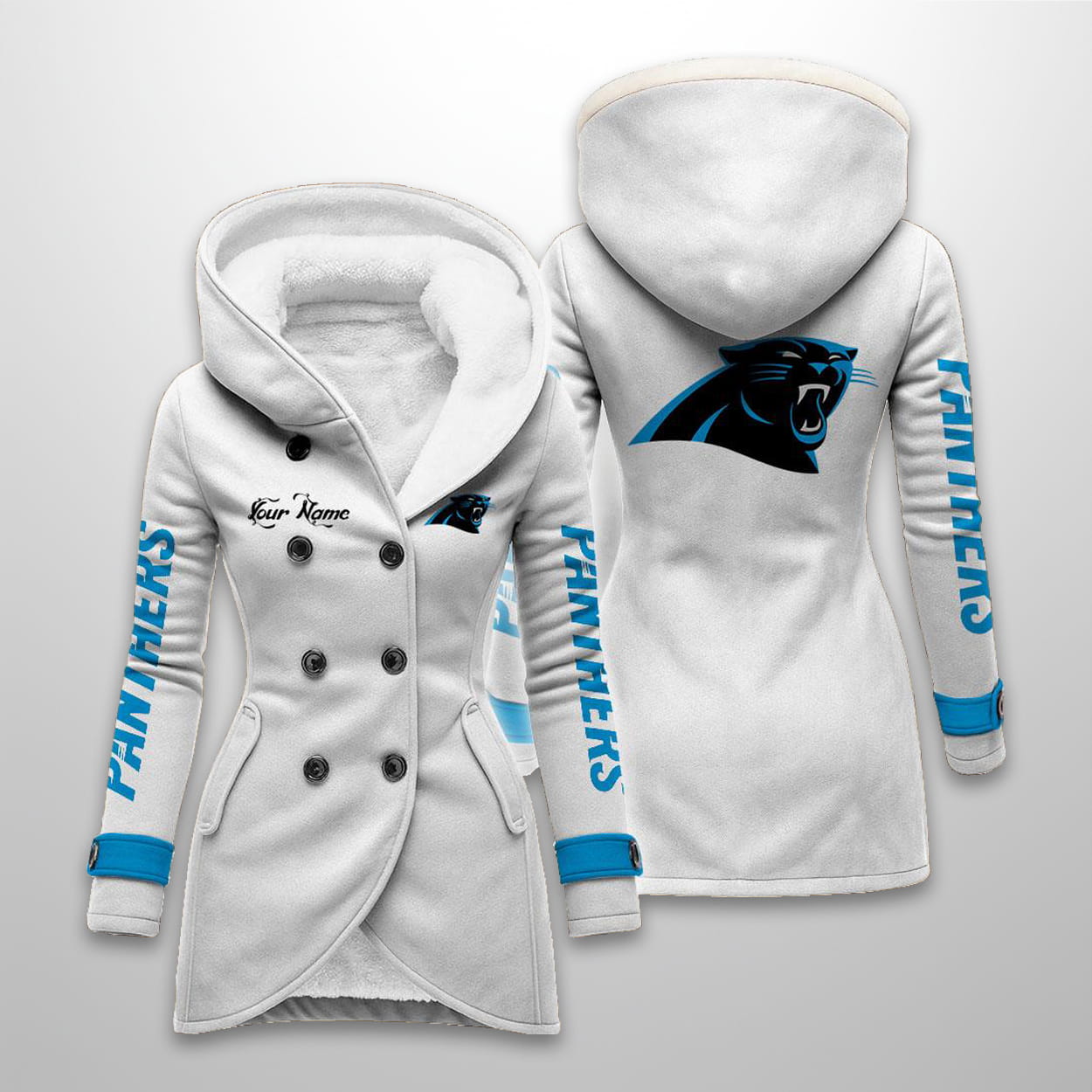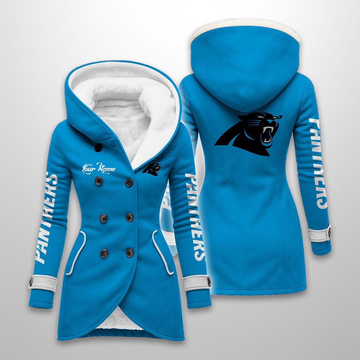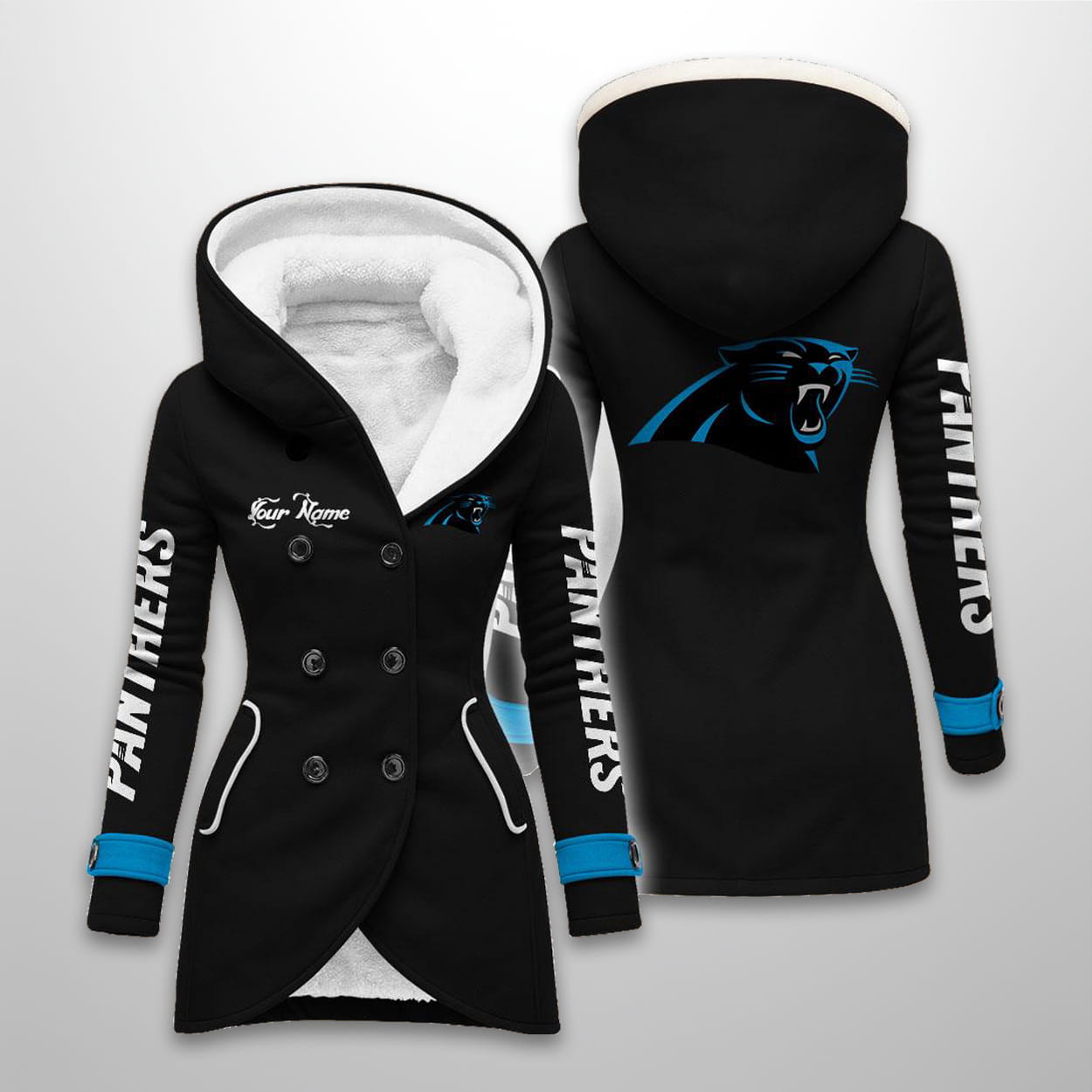 This long hooded fleece jacket is available in five colors (including Black, White, Pink, Blue, and Gray). The design prominently features the leaping Panthers logo on the back and a smaller logo on the chest. The sleeves display vertical “PANTHERS” text, and the coat includes a double-breasted button front and a plush sherpa-lined interior for superior warmth. It also features an area for personalization labeled “Your Name”.