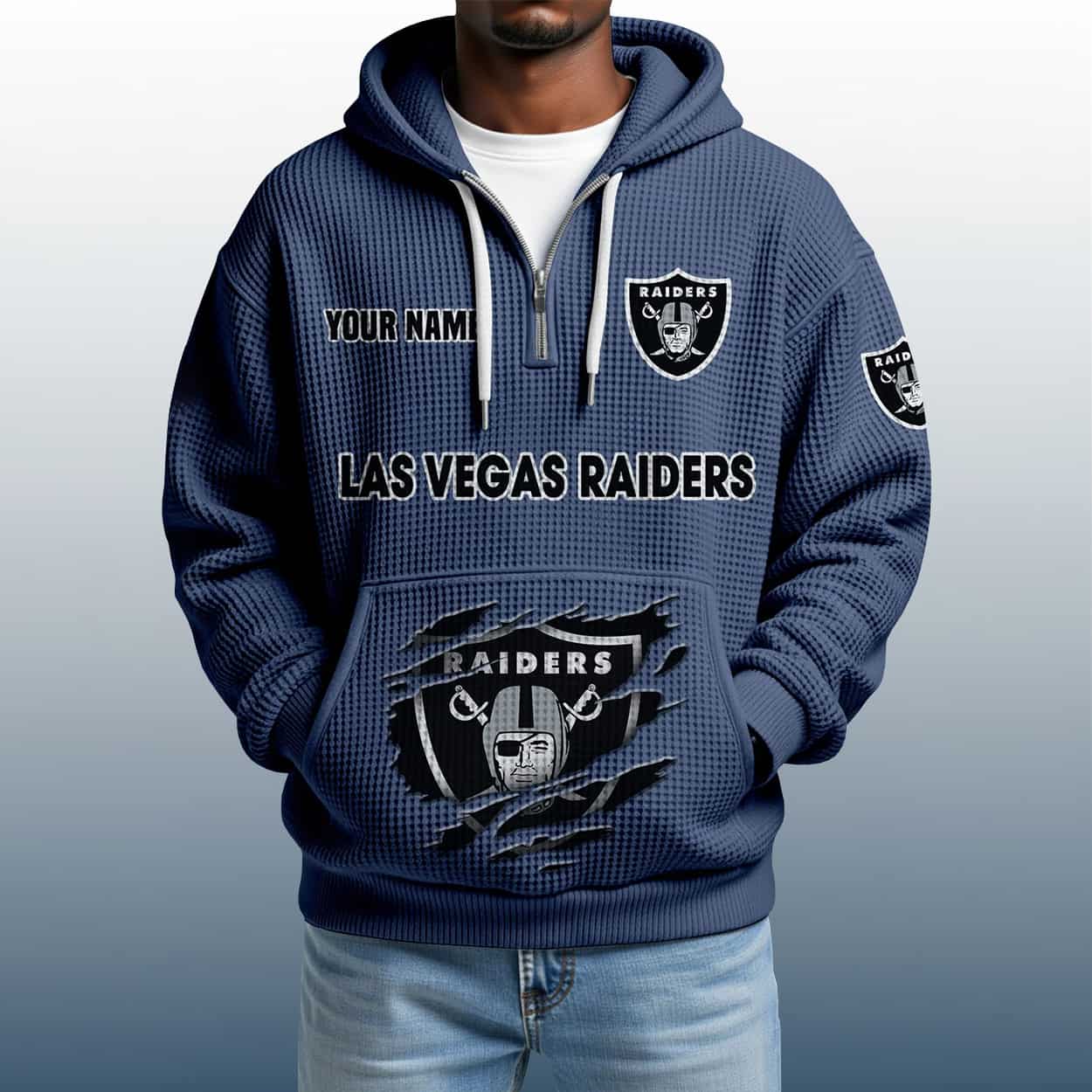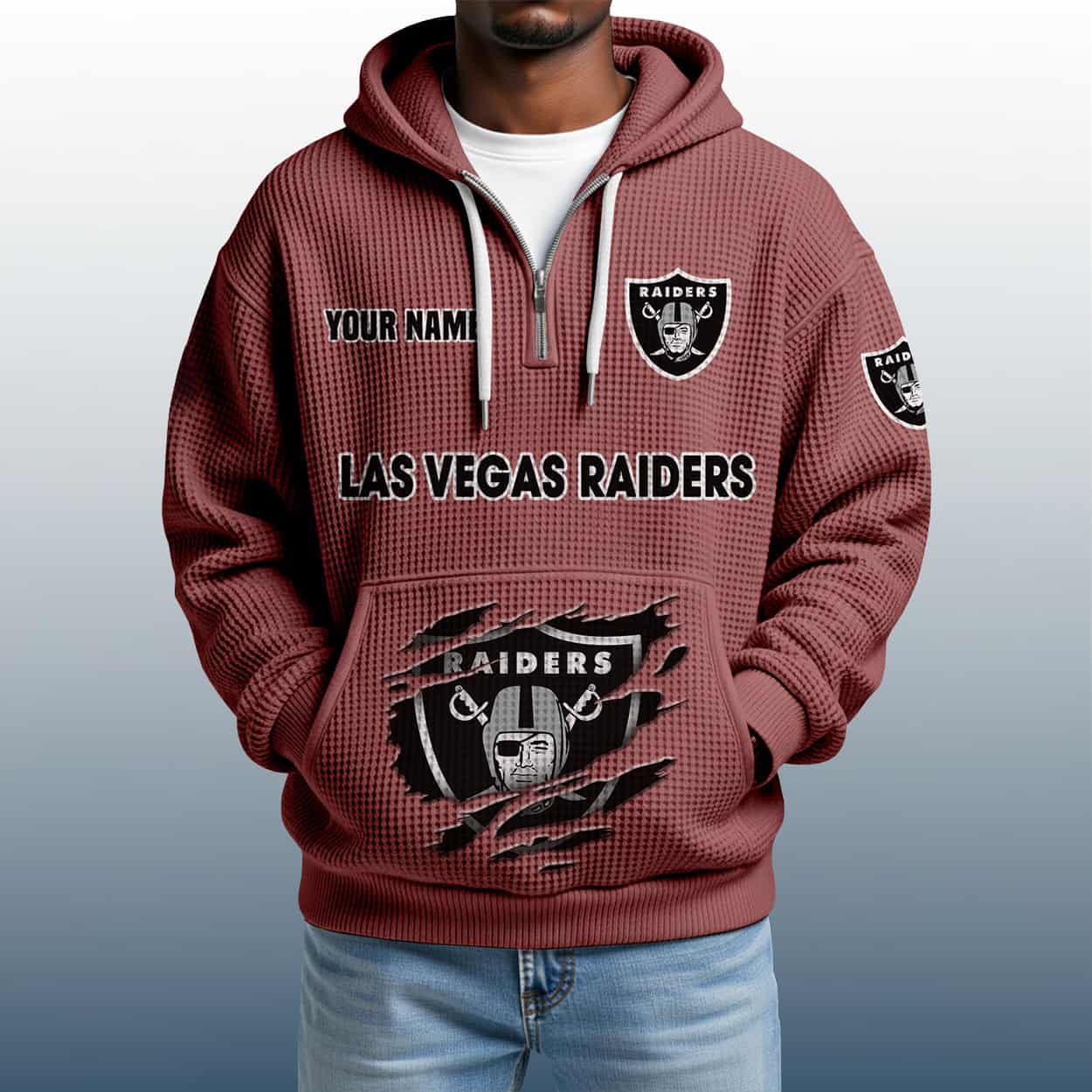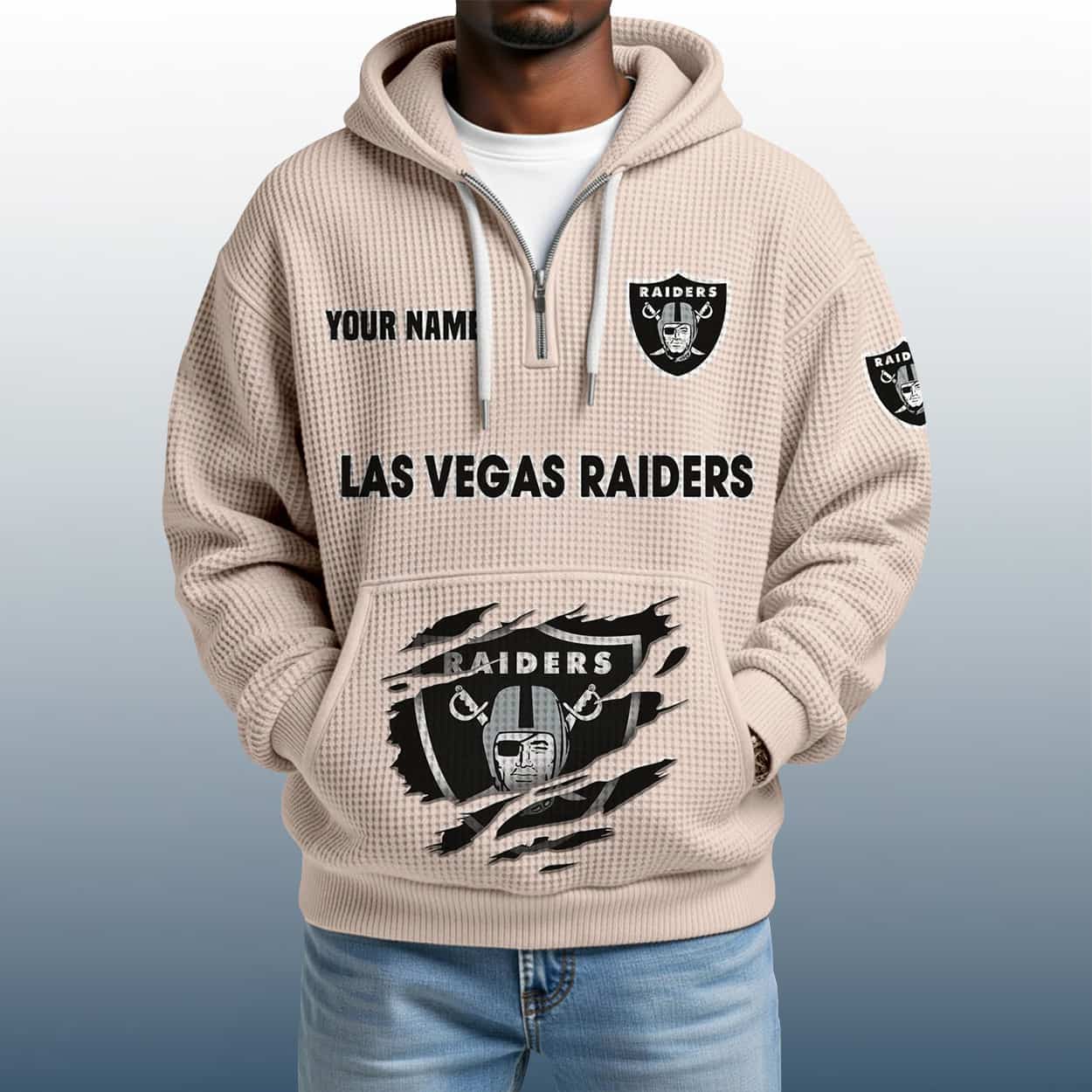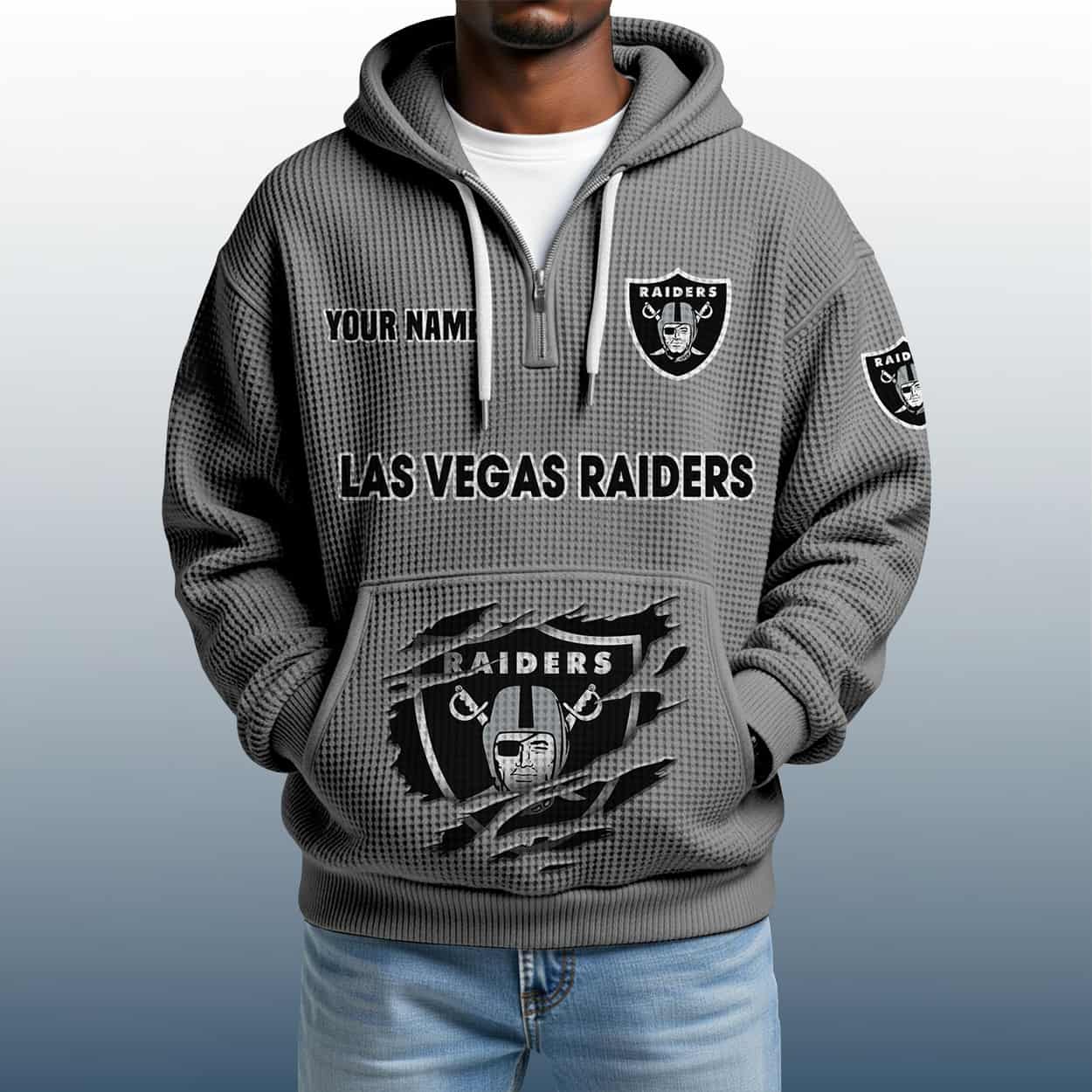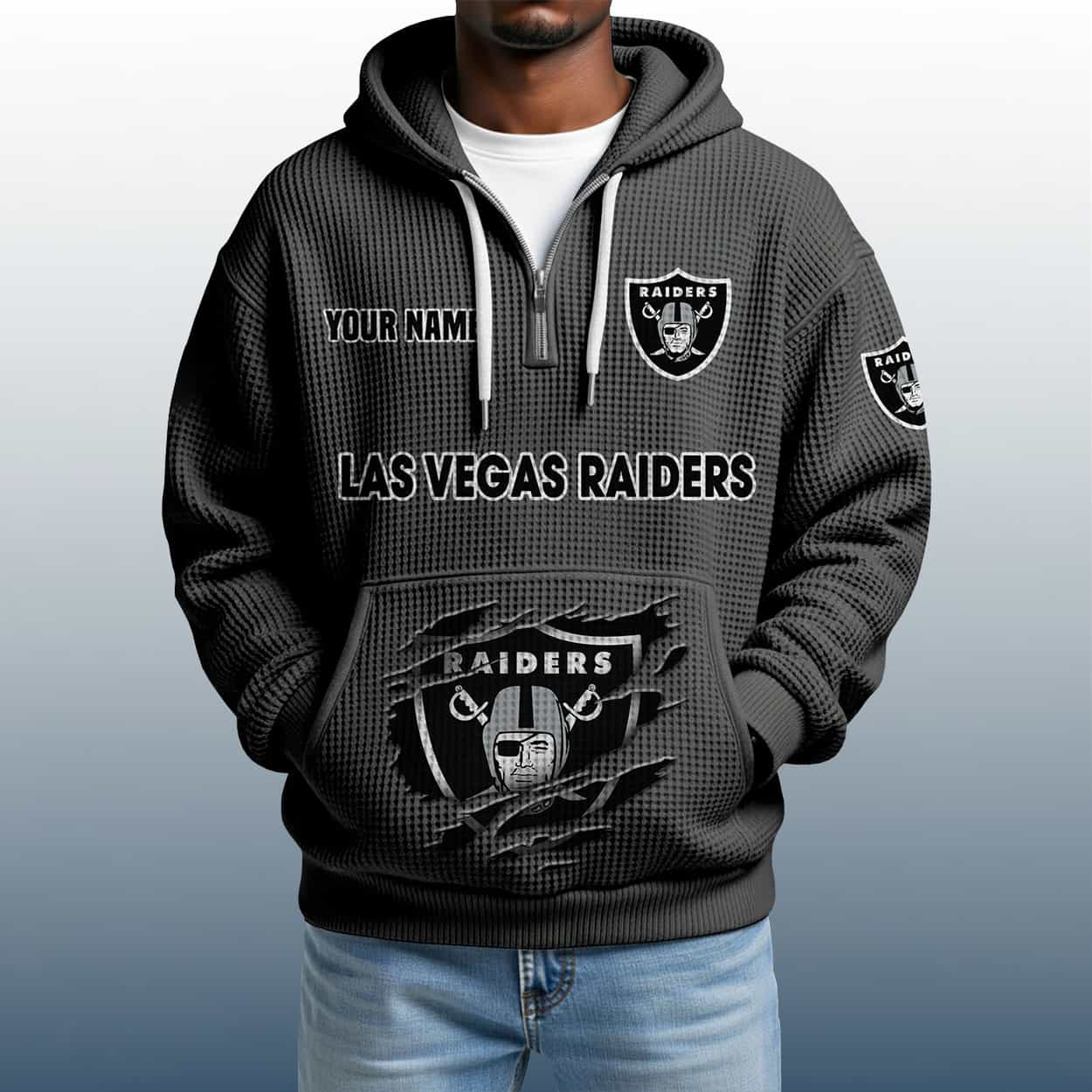 Thia hoodie is a bold fusion of team spirit and personal swagger. With a textured waffle design and sleek quarter-zip front, this hoodie is built for fans who want to stand out. “RAIDERS” stretches across the chest in commanding block letters, while your custom “YOUR NAME” tag sits proudly above it. The left sleeve and right chest feature additional Raiders logos, and the lower front showcases a dramatic helmet-and-swords emblem bursting through a torn fabric graphic—like your loyalty can’t be contained.