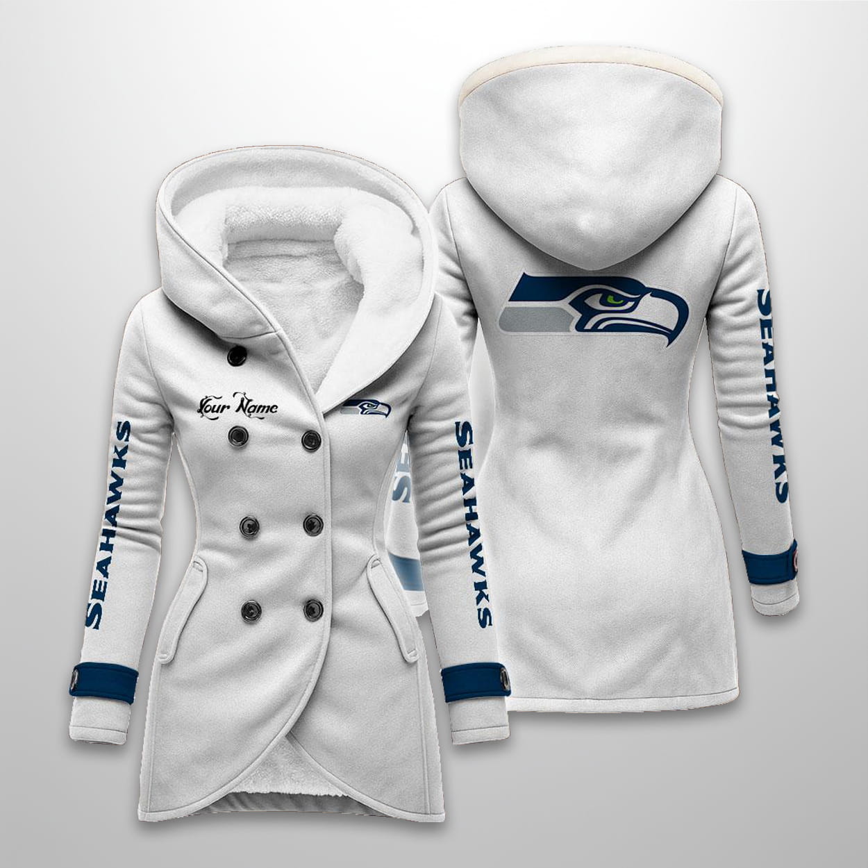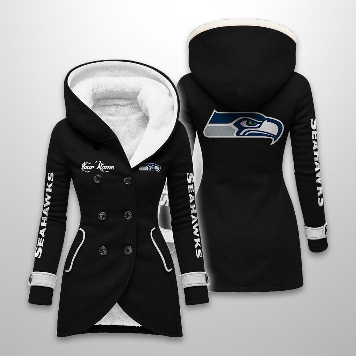 This long hooded fleece jacket is offered in five colors (including Navy, Green, Pink, Black, and White). The design features the sleek Seahawks logo prominently on the back and a smaller logo on the chest. The sleeves display bold, vertical “SEAHAWKS” text, and the coat includes a double-breasted button front and a plush sherpa-lined interior for superior warmth. It also includes an area for personalization labeled “Your Name”.
