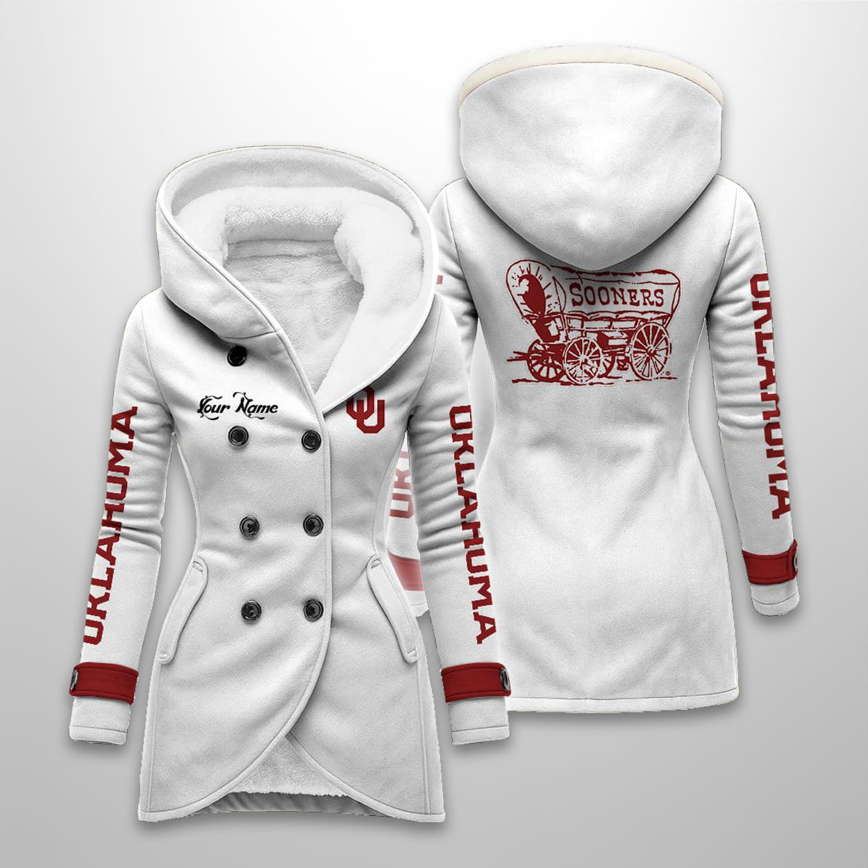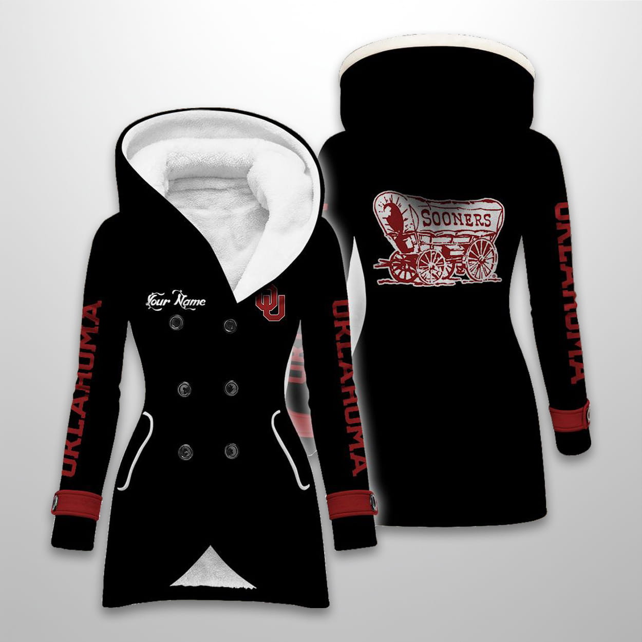 This long hooded fleece jacket is offered in five colors (including Crimson, White, Pink, Black, and Gray). The design features the Oklahoma Sooners ‘OU’ logo prominently on the back and a smaller logo on the chest. The sleeves display bold, vertical “SOONERS” text, and the coat includes a double-breasted button front and a plush sherpa-lined interior for superior warmth. It also includes an area for personalization labeled “Your Name”.