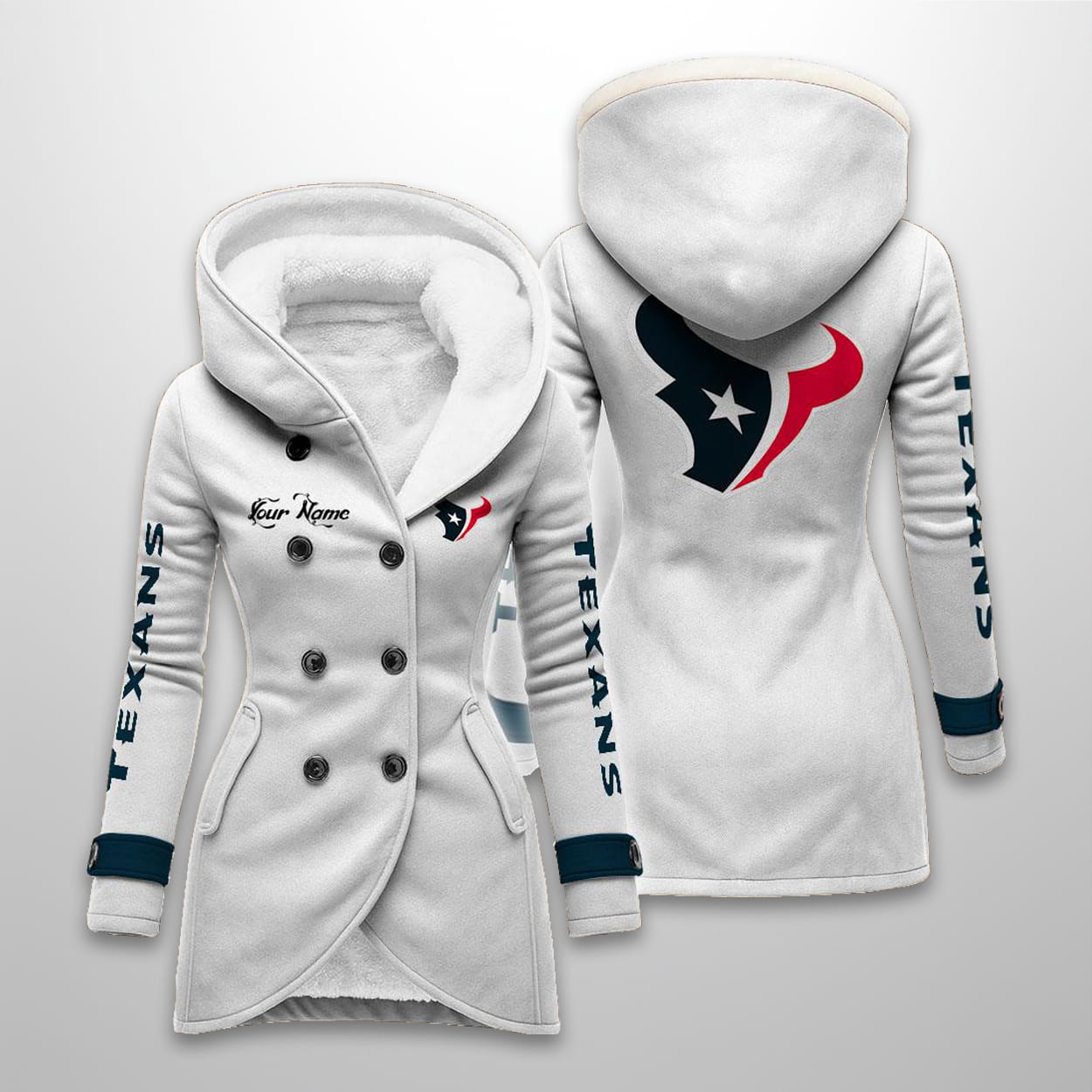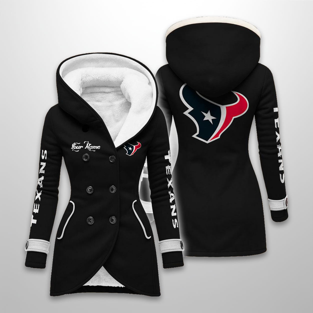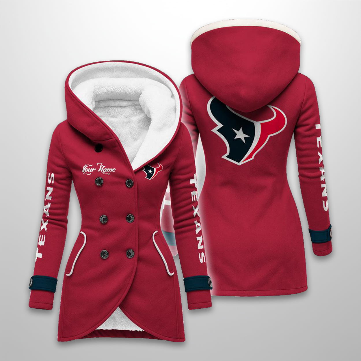 This long hooded fleece jacket is offered in five colors (including Deep Blue, Red, Pink, Black, and White). The design features the iconic Houston Texans bull logo prominently on the back and a smaller logo on the chest. The sleeves display bold, vertical “TEXANS” text, and the coat includes a double-breasted button front and a plush sherpa-lined interior for superior warmth. It also features an area for personalization labeled “Your Name”.
