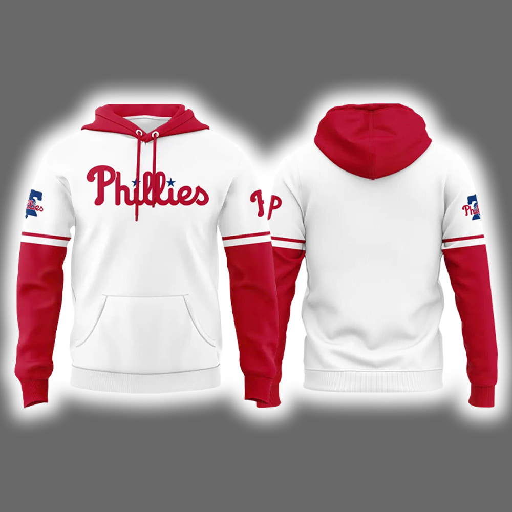 The 2025 Phillies Karen Hoodie is not just a piece of fan gear—it’s a full-blown attitude. Featuring a crisp white base with fiery red sleeves and hood, this hoodie screams Phillies pride with a twist. The front showcases “Phillies” in classic red cursive, punctuated by a cheeky blue star dotting the “i.” On the left sleeve, the iconic Liberty Bell logo anchors the team’s legacy, while the right sleeve boldly flaunts “Ph”—because subtlety isn’t the point.