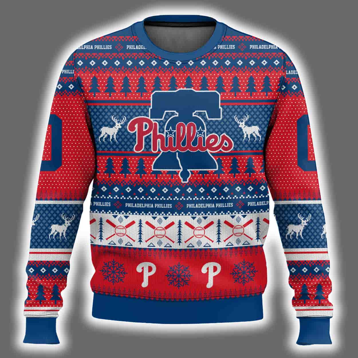 Get ready to turn heads and spread cheer with this sweater—a joyful explosion of team spirit and holiday charm. Drenched in Phillies red, blue, and white, this sweater features a delightful mix of snowflakes, reindeer, and baseball-inspired patterns. The front proudly showcases the Phillies logo in the center, framed by festive designs that wrap around the sleeves and torso. The number “00” and the letter “P” add a sporty touch to the sleeves and hem, while the back is all yours—customize it with your name above the number “00” to make it uniquely personal. Whether you’re decking the halls or dominating the holiday party circuit, this sweater is your ticket to seasonal stardom.