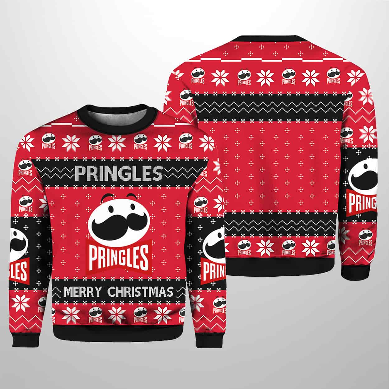 This sweater is a deliciously bold tribute to snack-time joy and seasonal silliness. Drenched in vibrant red with black and white accents, this sweater features a playful mix of snowflakes, zigzag patterns, and stylized Christmas trees. Front and center, the iconic Pringles logo beams with pride, flanked by the words “PRINGLES” above and “MERRY CHRISTMAS” below—because nothing says holiday spirit like a chip with a mustache. The back continues the festive fun with repeating Pringles logos and decorative motifs that keep the crunch going from every angle.