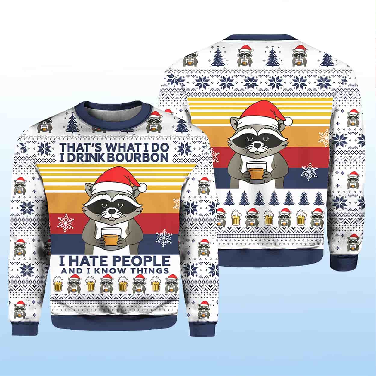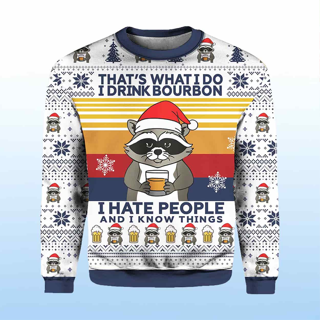 This sweater is the ultimate conversation starter for anyone who prefers bourbon over eggnog and sarcasm over small talk. Front and center, a mischievous cartoon raccoon rocks a Santa hat and clutches a cup like it’s his fifth round at the North Pole bar. Surrounding him are festive snowflakes, Christmas trees, and repeating raccoon motifs that add a playful twist to the traditional holiday palette. The bold white text reads: “THAT’S WHAT I DO. I DRINK BOURBON. I HATE PEOPLE. AND I KNOW THINGS.”—a cheeky manifesto for the unapologetically honest.
