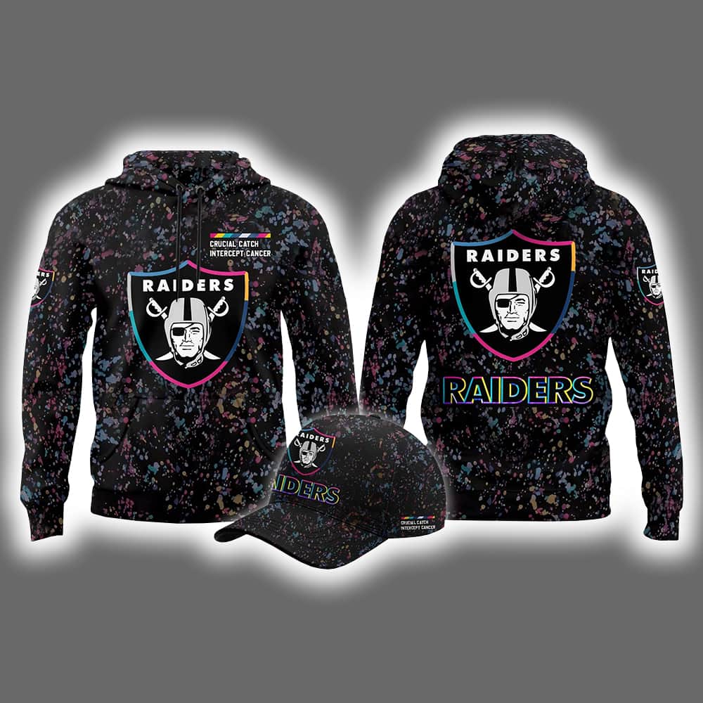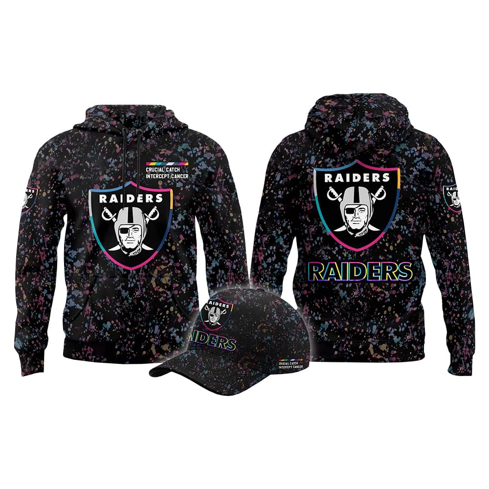 Step into the season with swagger and purpose in the 2025 Raiders Crucial Catch Intercept Cancer Hoodie Cap. This electrifying combo features two hoodies and a matching cap, each drenched in a vivid splatter pattern that screams individuality. The classic Raiders shield—complete with the helmeted warrior and crossed swords—takes center stage, while “RAIDERS” pops in either crisp white or a kaleidoscope of colors. The cap mirrors the hoodie’s energy, tying the look together like a touchdown celebration.