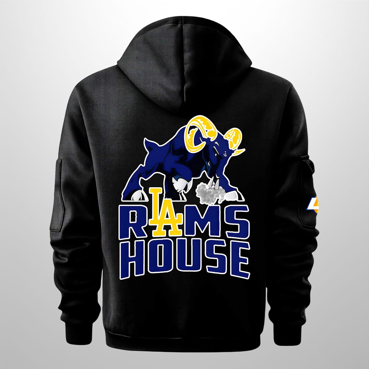 Whether you’re tailgating at SoFi or repping your team on the streets, this hoodie is your ultimate game-day flex. The front features a dynamic mashup of Rams branding: the iconic blue-and-yellow ram’s head, bold “RAMS” lettering, and sleeve accents that include a crisp white ram and the sleek LA logo. Flip it around and boom — the back explodes with a full-color graphic of a powerful ram towering over a stylized Los Angeles skyline, crowned by the rallying cry “RAMS HOUSE” in electric blue and yellow. It’s not just a hoodie — it’s a declaration.