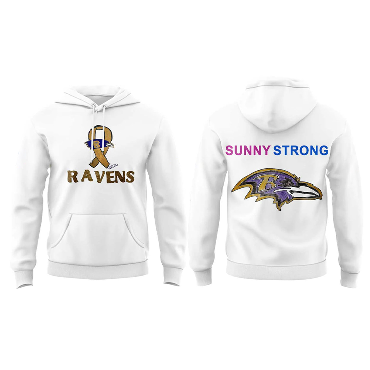 This collection is more than just fan gear—it’s a full-on statement. The white hoodie steals the spotlight with a glittering gold ribbon and the iconic Ravens logo front and center, while “RAVENS” shimmers boldly beneath. Flip it around and you’re greeted with “SUNNY STRONG” in vibrant pink and blue, crowned by a large Ravens emblem that radiates resilience.