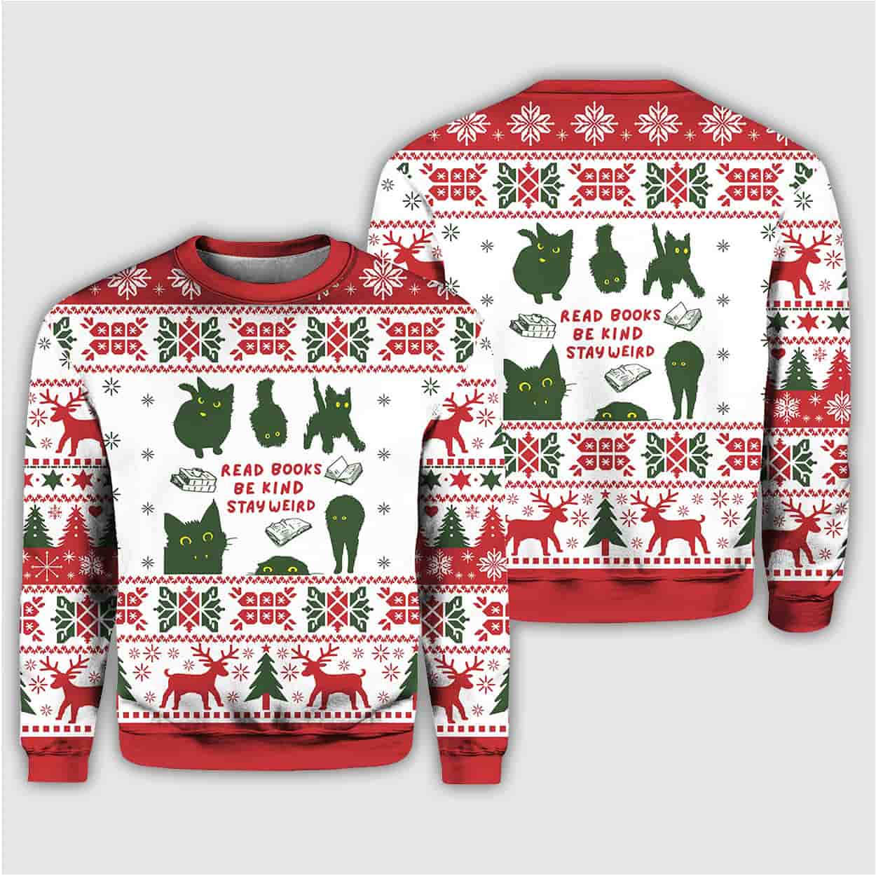 Deck the halls—and yourself—in unapologetic joy with this sweater. This vibrant holiday essential bursts with red, green, and white cheer, featuring classic motifs like snowflakes, reindeer, and Christmas trees. But the real showstopper? A parade of green cats with expressive faces, lounging beside open books, adding a dash of feline mischief to your festive flair. Bold block lettering in red and green spells out your holiday mantra: “READ BOOKS BE KIND STAY WEIRD.” It’s cozy, colorful, and guaranteed to spark conversations at every seasonal gathering.