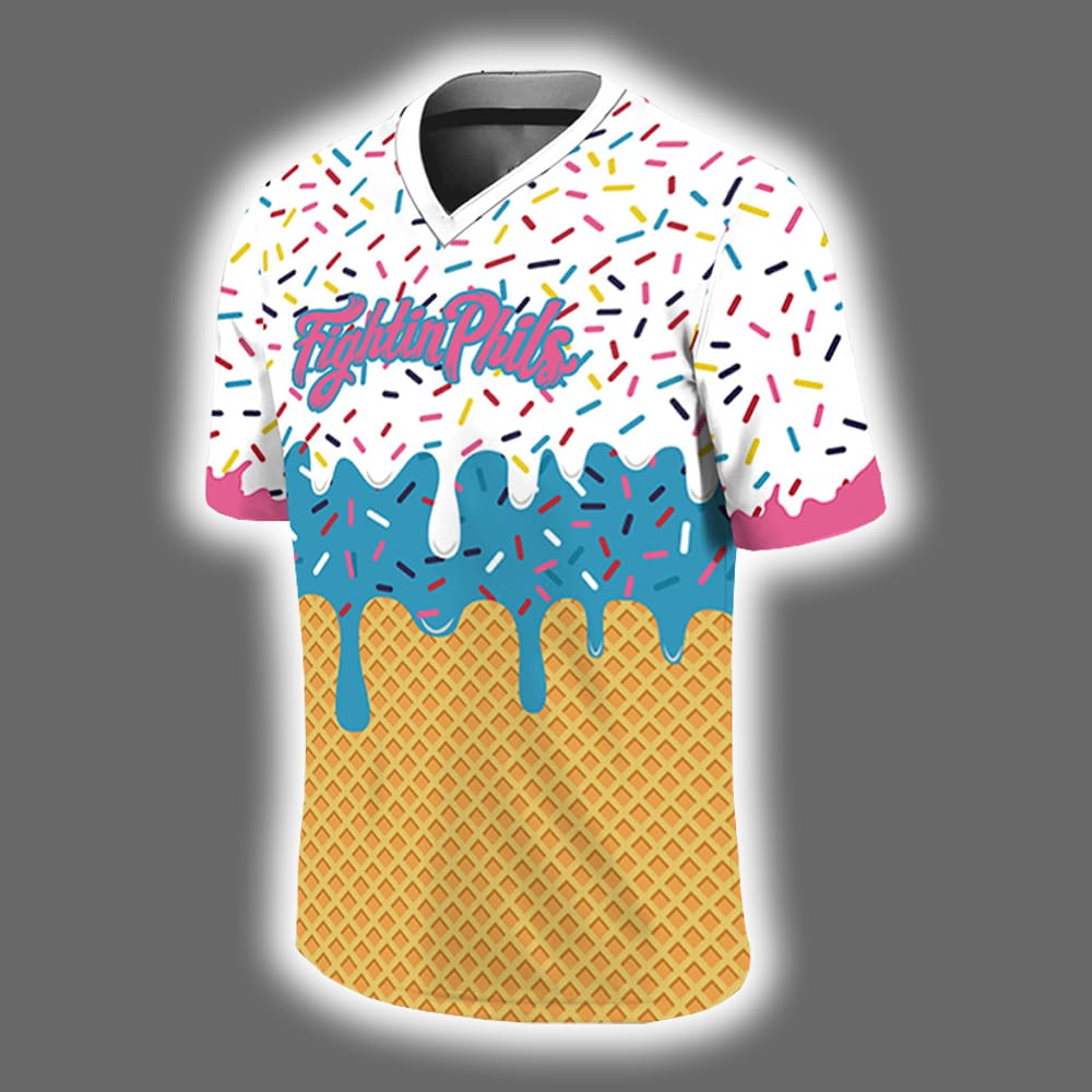This jersey was whipped up to celebrate the joy of summer baseball and the nostalgia of chasing the ice cream truck. It’s a wearable celebration of flavor, fun, and fearless fandom. Designed for those who dare to stand out, it’s more than just a uniform—it’s a sugar-rush of personality. Whether you’re cheering from the stands or strutting through town, this jersey makes every moment feel like a party.