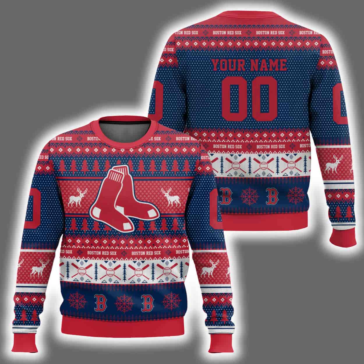 Get ready to turn heads and warm hearts with this sweater—a merry mashup of baseball spirit and seasonal charm. Featuring a vibrant red, white, and blue color scheme, this sweater is decked out with snowflakes, reindeer, and geometric patterns that scream holiday joy. The front showcases the iconic red socks logo, while the back lets you personalize it with your name and number. Red Sox logo and festive accents on the sleeves and hem complete the look, making this sweater a grand slam for any Sox fan.