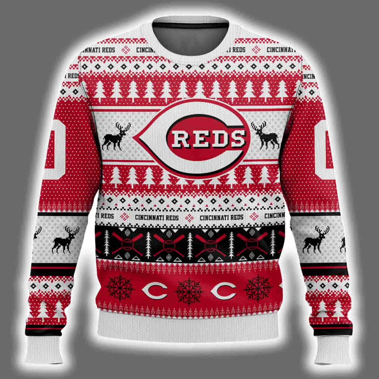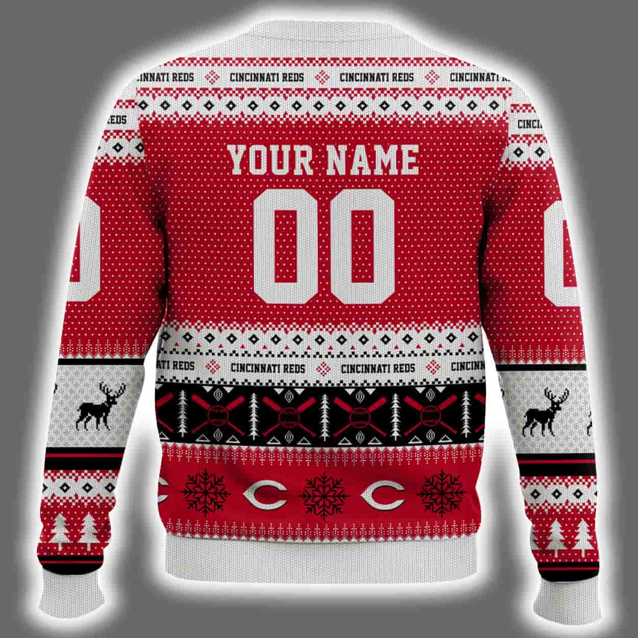 Get ready to sleigh the season with this sweater—a joyful collision of holiday tradition and baseball devotion. Drenched in Cincinnati Reds red with crisp white and black accents, this sweater features a bold front-and-center Reds logo surrounded by playful patterns like snowflakes, reindeer, trees, and baseball motifs. The sleeves and back carry the number “00” and a customizable nameplate, letting you personalize your look with fan flair. With symmetrical designs and team branding woven throughout, it’s the perfect way to show off your love for the Reds while embracing the festive spirit.