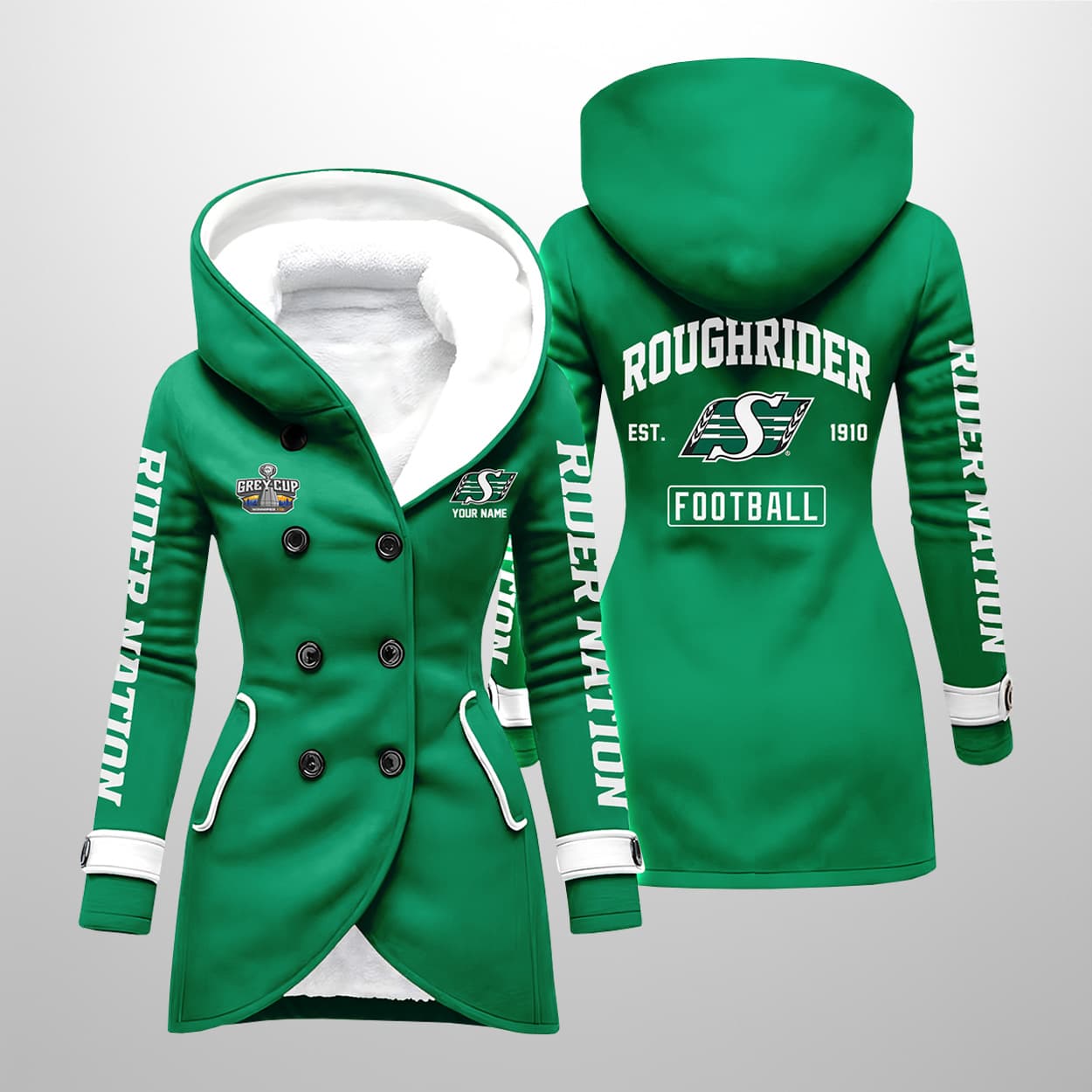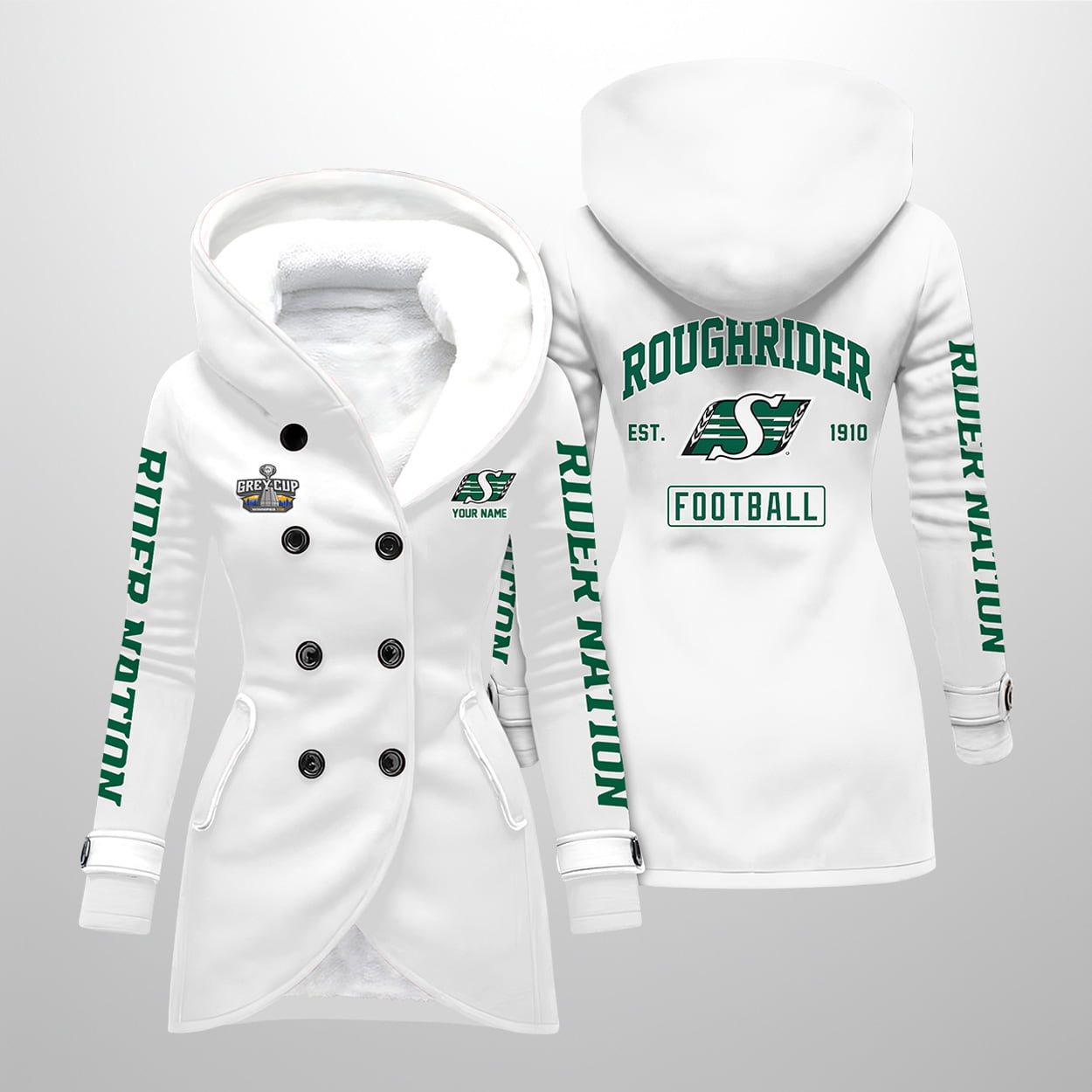 Step into the winner’s circle with this jacket. This eye-catching green coat is a tribute to triumph, featuring a sleek double-breasted front, crisp white trim on the cuffs and pockets, and a cozy hood lined in championship white. The left chest proudly displays the “SASKATCHEWAN ROUGHRIDERS” name and logo—because subtlety isn’t in our playbook. Flip it around and you’ll find the bold proclamation “112TH GREY CUP CHAMPIONS 2025” stamped across the back, flanked by the team’s iconic emblem.