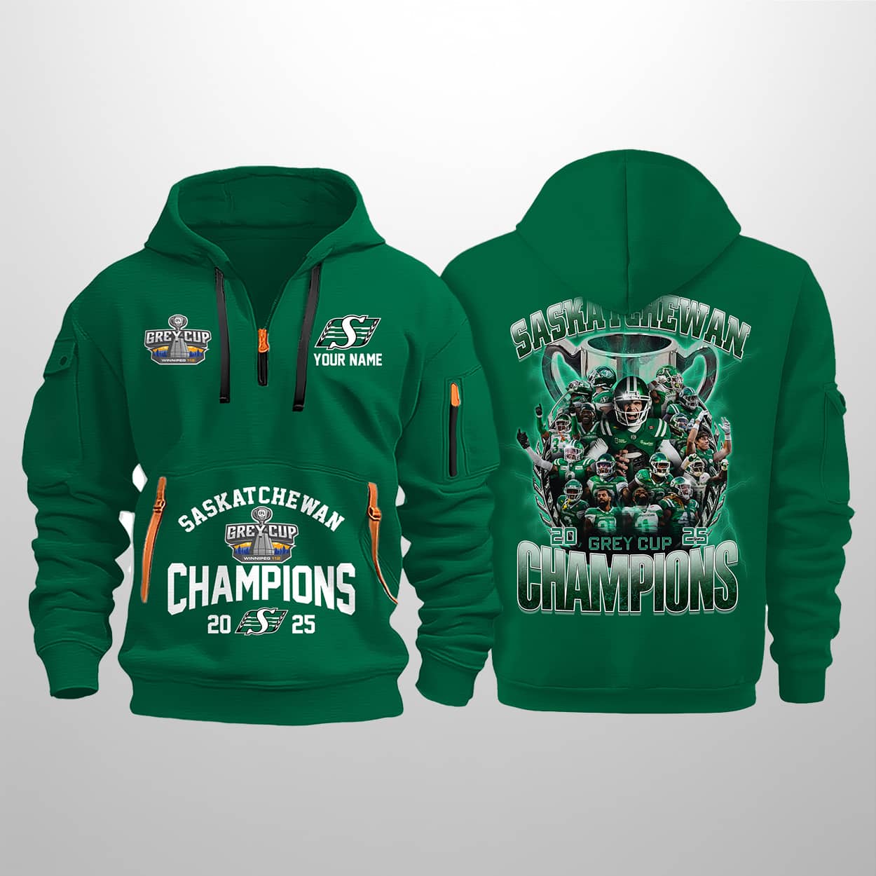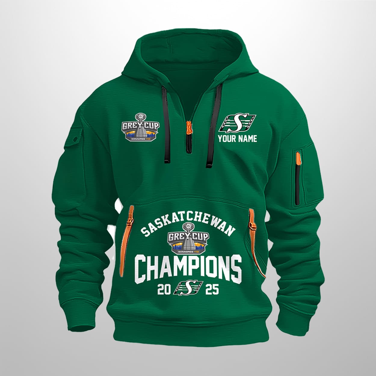 Step into the winner’s circle with the ultimate fan gear. Drenched in Rider green and accented with fiery orange zippers, this hoodie screams celebration. The front proudly displays “SASKATCHEWAN ROUGHRIDERS,” “YOUR NAME,” and “CHAMPIONS 2025,” flanked by the official Grey Cup and team logos. It’s not just a hoodie—it’s a wearable trophy.