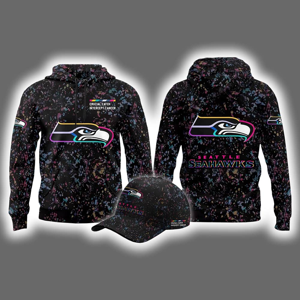 Turn heads and tackle cancer awareness with the 2025 Seahawks Crucial Catch Intercept Cancer Hoodie Cap. This eye-catching combo features a black base splashed with a riot of color—like a paintball fight broke out at a tailgate party. The hoodie proudly displays the Seahawks logo front and center, flanked by the bold “Crucial Catch Intercept Cancer” text in multicolored lettering on the chest. Below that, “SEAHAWKS” pops in red and white, making sure your team pride is unmistakable. The matching cap carries the same vibrant energy, with the campaign slogan printed on the side like a badge of honor.