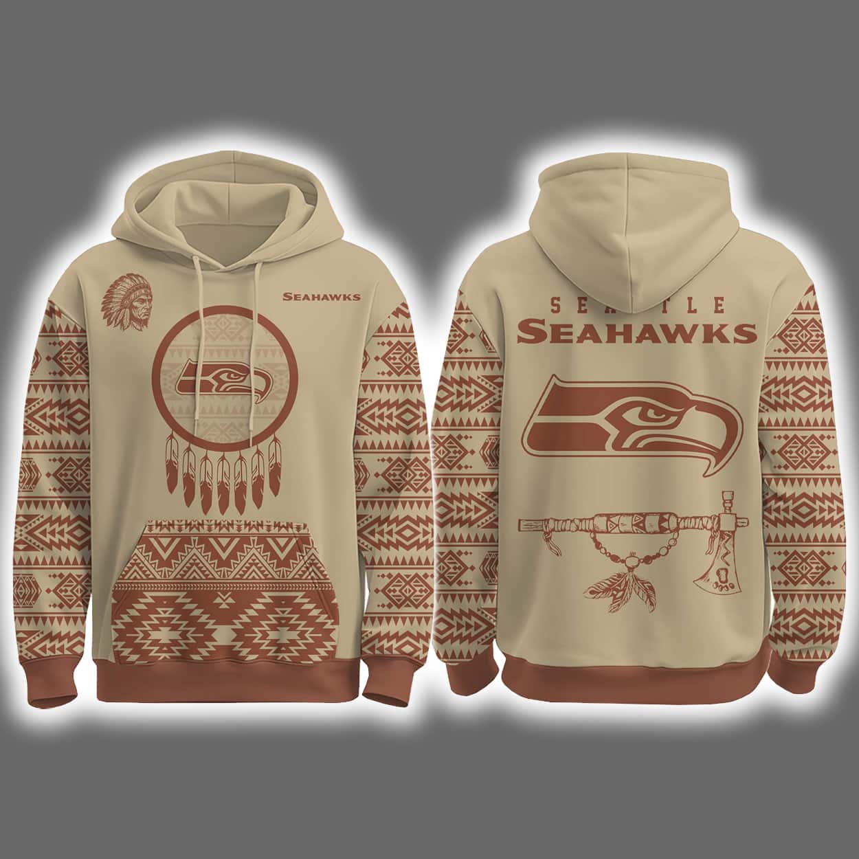 Fly high in style with this set—a bold trio of hoodie, joggers, and cap that brings cultural depth to game-day fashion. The hoodie features a circular dreamcatcher design with the Seahawks logo at its heart, flanked by five flowing feathers and a profile illustration of a Native American chief. “SEAHAWKS” is printed above in strong, earthy tones, while tribal geometric patterns wrap the sleeves and hem in rich browns. The joggers echo the same motifs, with the team logo proudly displayed on the thigh. The cap completes the look with “SEAHAWKS” printed across the front and a feather emblem that adds a touch of tradition.