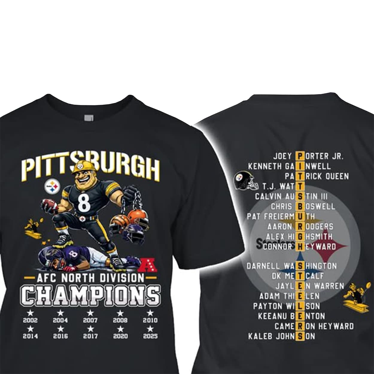 Turn heads and spark conversations with this shirt—a wearable celebration of Pittsburgh’s dominance. The front bursts with energy: “PITTSBURGH” blazes in bold yellow above a dynamic cartoon-style football hero in black and gold, proudly clutching the pigskin. Below, the phrase “AFC NORTH DIVISION CHAMPIONS” stands tall with the AFC logo, flanked by a timeline of championship seasons from 2002 to 2025. It’s not just a shirt—it’s a scoreboard of legacy.