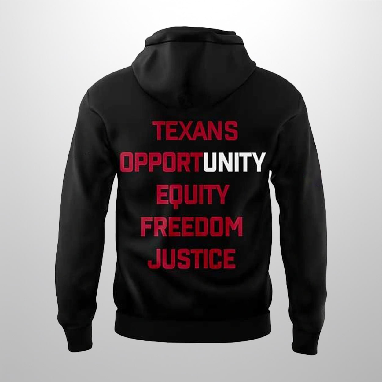 This hoodie was made for those who don’t just wear clothes—they wear convictions. Every word printed on it is a call to action, a reminder that change starts with us. The design’s sharp contrast and strategic emphasis on “UNITY” reflect the Texans’ commitment to progress, inclusion, and community. It’s not just fashion—it’s a movement stitched into every thread.