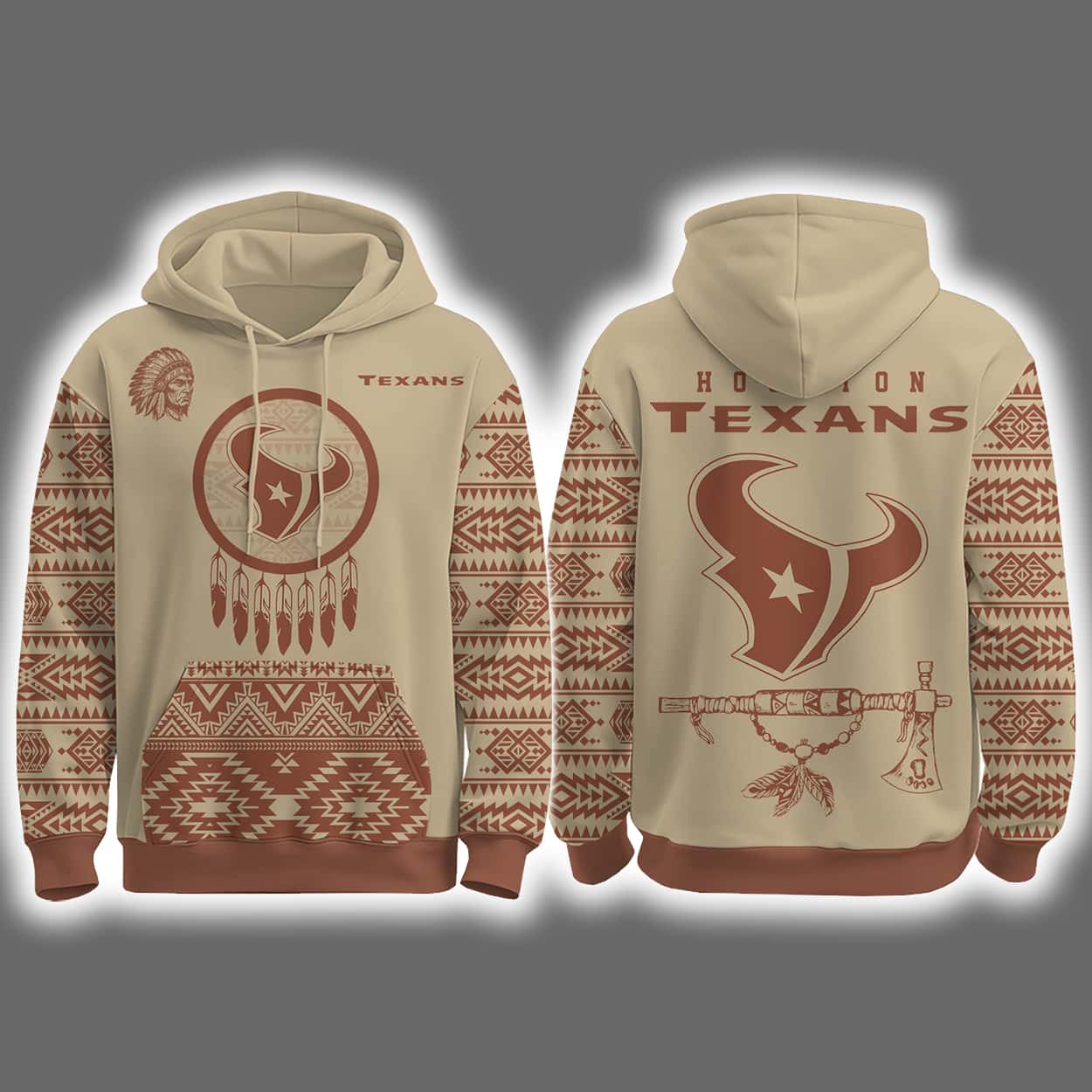 This set is a striking tribute to tradition and team loyalty. The hoodie features a beige base with rich maroon tribal patterns flowing across the sleeves and hem. Front and center, a circular dreamcatcher cradles the Texans’ bull logo, with feathers cascading below. “TEXANS” is printed near the right shoulder, balanced by a Native American chief’s profile on the left. On the back, “TEXANS” crowns a bold team logo, anchored by a feather-adorned rifle graphic. The joggers mirror the tribal motifs for a cohesive look, and the cap completes the ensemble with a feather-accented Texans emblem that ties the theme together.