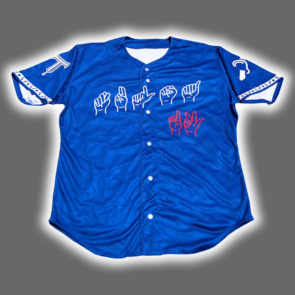 Step up to the plate in style and solidarity with the 2025 Tulsa Drillers Celebrating Hearing Loss Awareness Night Jersey. This electric blue button-down is more than just a uniform—it’s a conversation starter. Across the chest, a striking lineup of white hand signs in American Sign Language (ASL), with the word echoed below in bold red lettering for double the impact. Each sleeve adds its own flair: white hand signs paired with geometric triangle patterns that pop with personality. The rounded hem and crisp white buttons give it a classic baseball silhouette, but the message it carries is anything but ordinary.