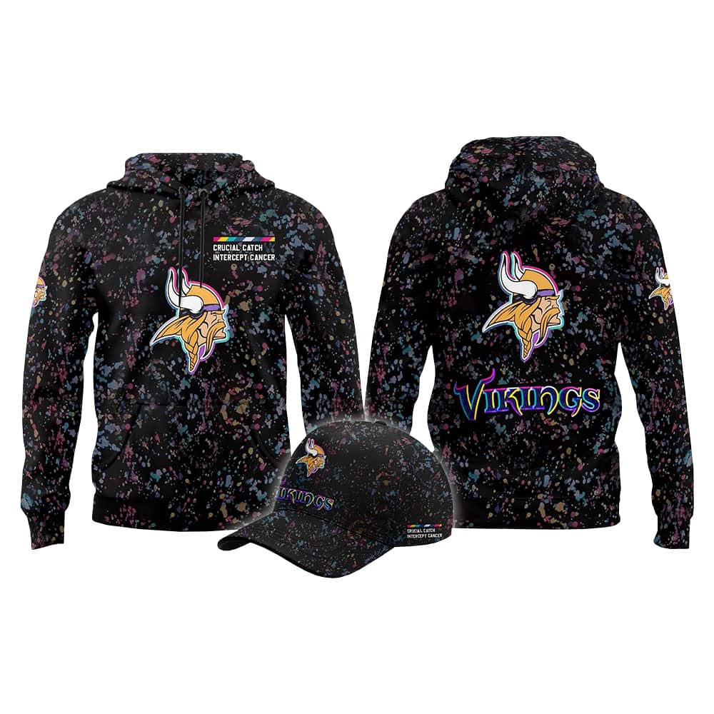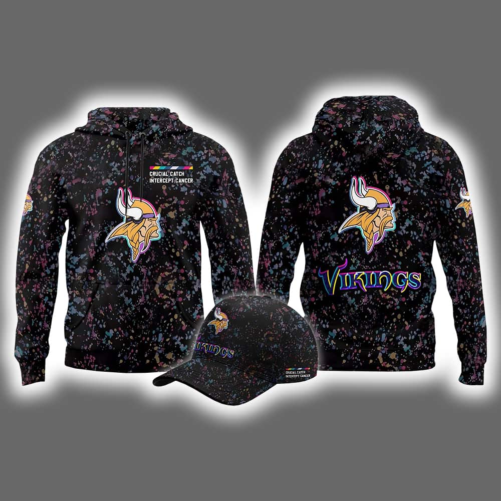 Turn heads and tackle cancer with the 2025 Vikings Crucial Catch Intercept Cancer Hoodie Cap. This dynamic duo features a black canvas splashed with electrifying paint strokes—think purple, gold, and teal chaos that screams confidence. The hoodie showcases the fierce Minnesota Vikings logo front and center, with “VIKINGS” boldly stamped below in stylized lettering that’s as fearless as your fandom. The cap carries the same energy, with matching splatter and logo, making it the perfect top-off to your game-day look or everyday statement.