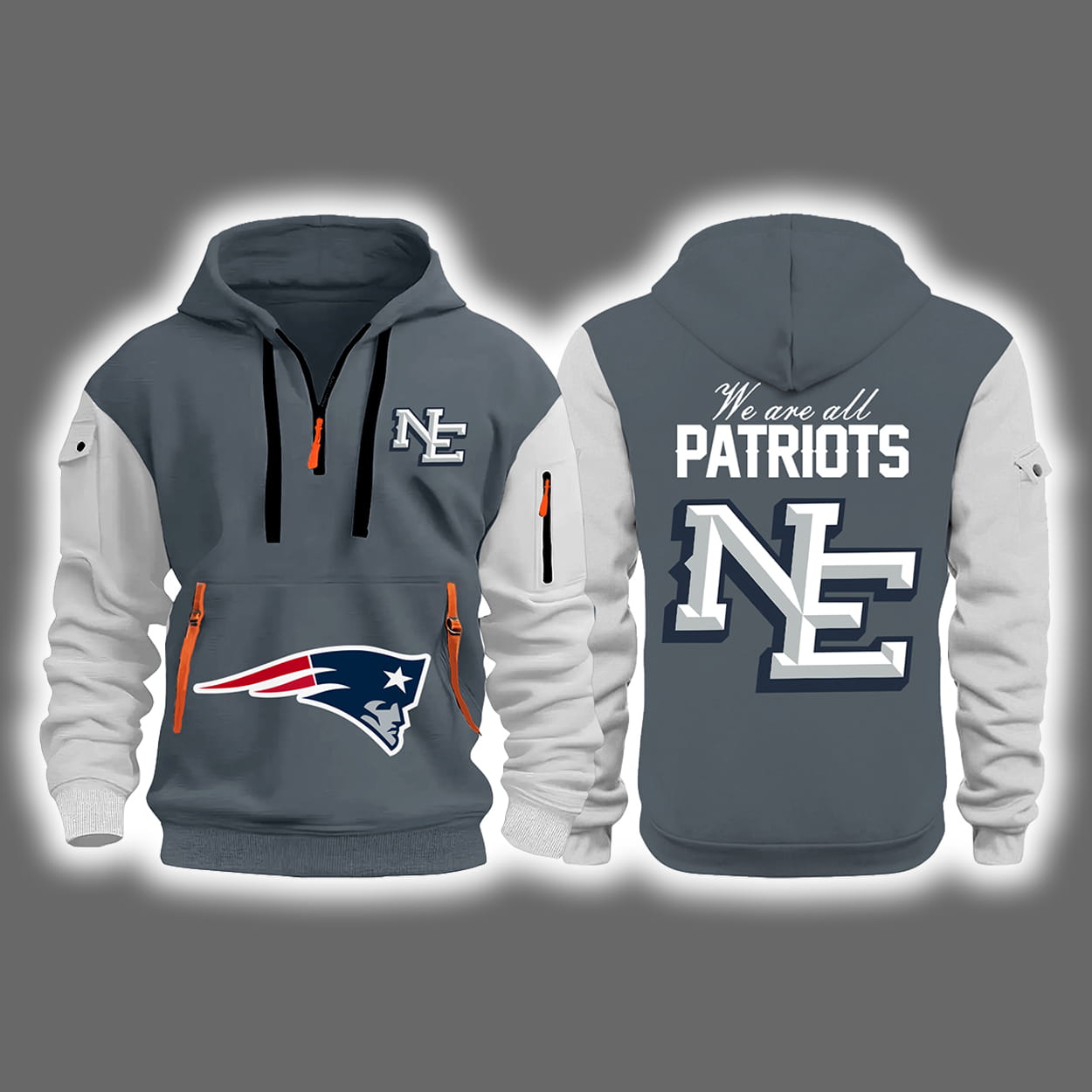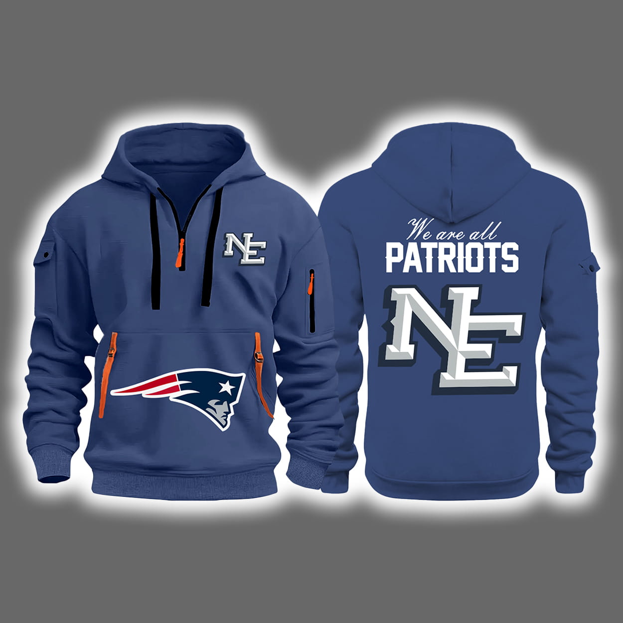 Step up your game-day style with this hoodie. Drenched in the team’s classic royal blue, this design instantly commands attention. The front proudly features the legendary “Flying Elvis” logo along with a prominent, stylized “NE” block logo on the chest. The unique quarter-zip styling is enhanced by sporty orange zip pulls, adding a vibrant pop of color to the functional pockets and neck opening. Flip it around, and you’ll see the unifying mantra: “We are all PATRIOTS” arching above a huge, modern “NE” graphic, making a powerful statement of fan unity.