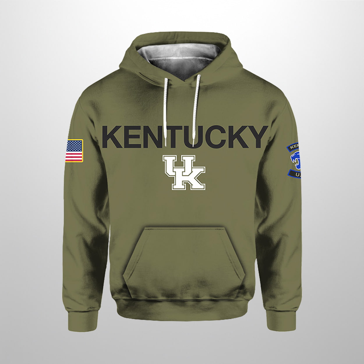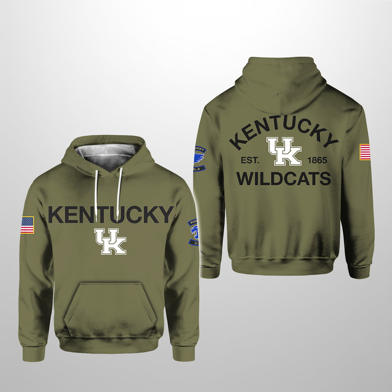 This hoodie is a green powerhouse of pride and purpose. On the front, “KENTUCKY” stretches across the chest in bold black letters, sitting above the classic white “UK” logo that speaks volumes without saying a word. The back continues the story with “KENTUCKY” at the top, followed by the “UK” logo, “EST. 1865,” and “WILDCATS” anchoring the design. Both sleeves salute service with American flag near the shoulders, while the right sleeve adds a splash of blue graphic detail for extra visual punch. It’s a hoodie that blends tradition, tribute, and tenacity in one unforgettable look.