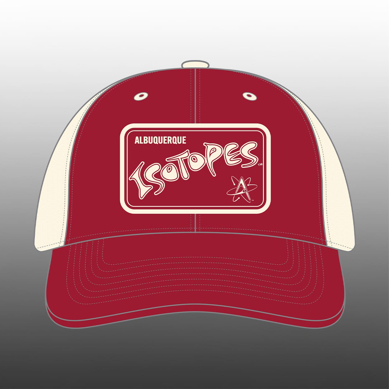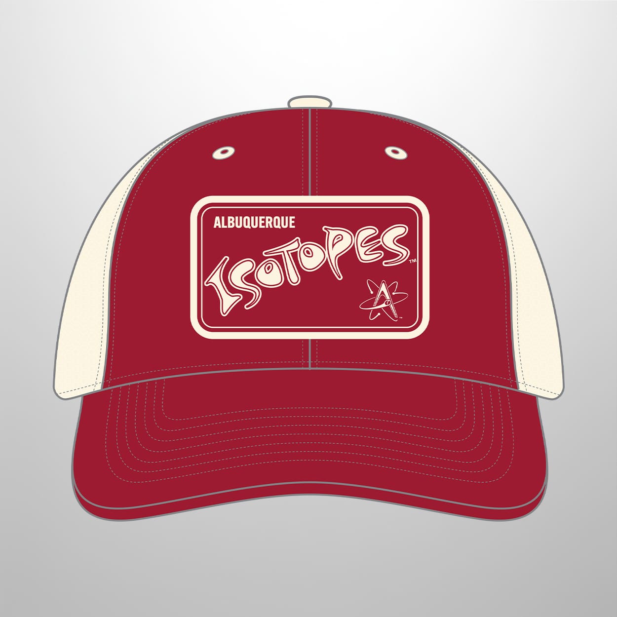 Step into the ballpark with a hat that’s more than just headwear—it’s a statement. This hat features a vibrant red front and bill, paired with cream-colored side panels for a classic yet eye-catching contrast. Front and center, a rectangular patch proudly displays “ALBUQUERQUE ISOTOPES” in stylized white lettering against a bold red background. Just beneath, a playful atomic symbol adds a spark of energy, nodding to the team’s name and the city’s scientific spirit.