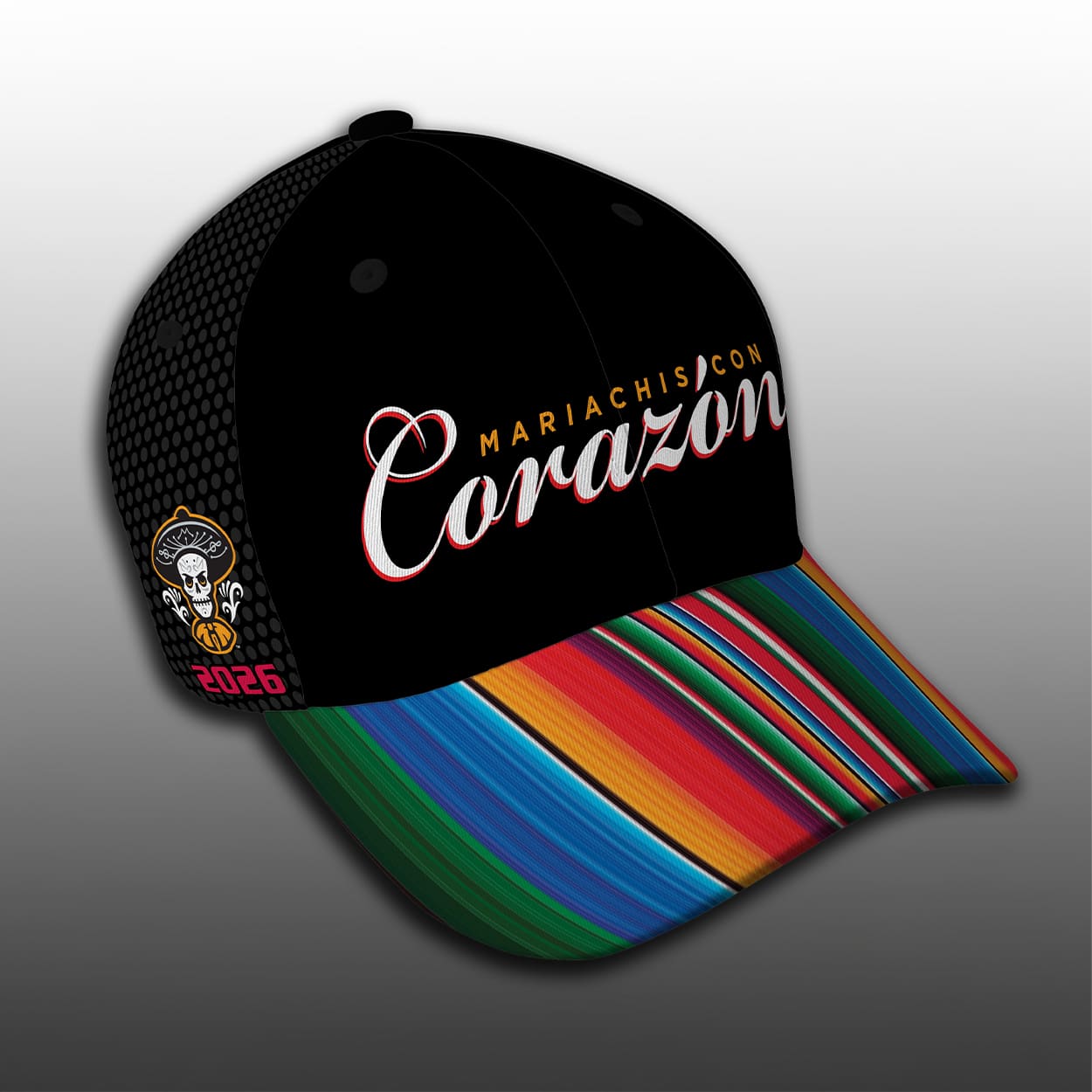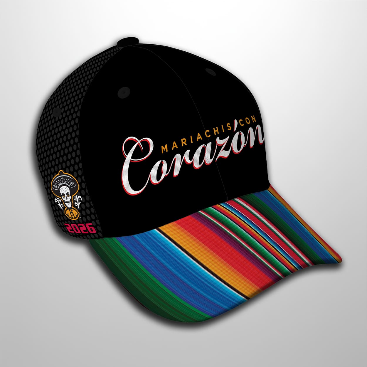 This cap brings a burst of color and personality to the ballpark. The front proudly displays the word “Corazon” in sweeping script, framed by the phrase “Mariachis con” above it, instantly evoking passion and rhythm. The brim steals the show with a lively striped pattern inspired by traditional Mexican textiles, radiating energy with every shade. On the side, a playful skeleton in a sombrero nods to Día de los Muertos, while the bold red “2026” marks this year’s edition. This cap isn’t just headwear—it’s a keepsake that captures the spirit of mariachi music and baseball celebration.